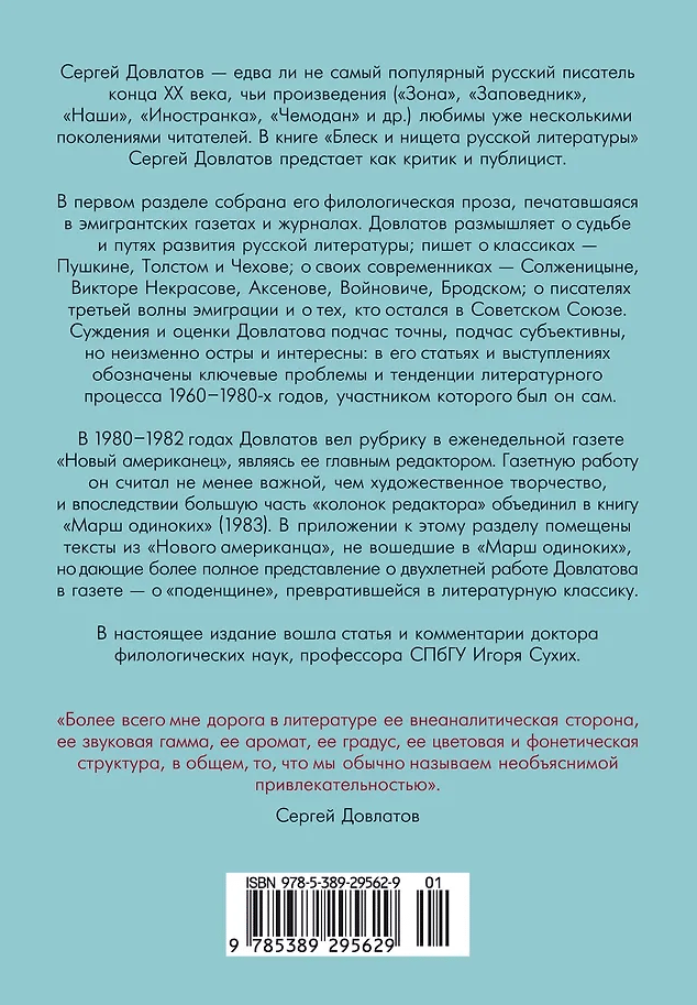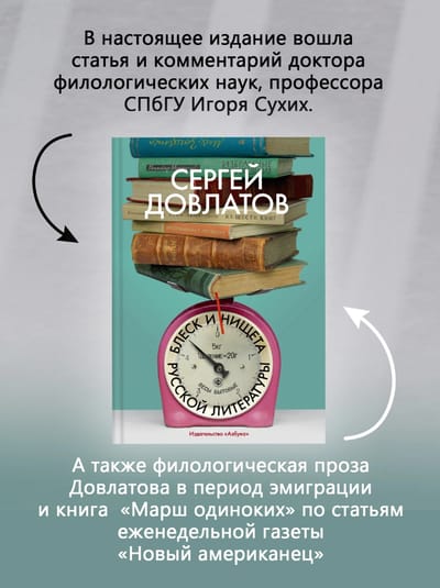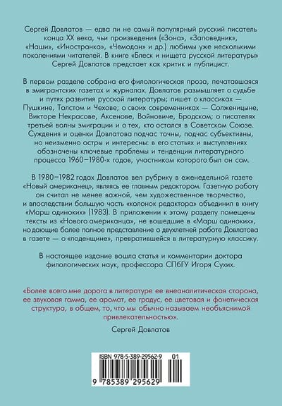 Сергей Довлатов — едва ли не самый популярный русский писатель конца ХХ века, чьи произведения («Зона», «Заповедник», «Наши», «Иностранка», «Чемодан» и др.) любимы уже несколькими поколениями читателей. В книге «Блеск и нищета русской литературы» Сергей Довлатов предстает как критик и публицист.