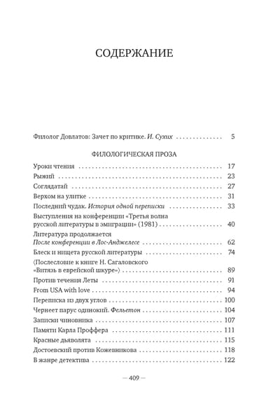 В первом разделе собрана его филологическая проза, печатавшаяся в эмигрантских газетах и журналах. Довлатов размышляет о судьбе и путях развития русской литературы; пишет о классиках — Пушкине, Толстом и Чехове; о своих современниках — Солженицыне, Викторе Некрасове, Аксенове, Войновиче, Бродском; о писателях третьей волны эмиграции и о тех, кто остался в Советском Союзе. Суждения и оценки Довлатова подчас точны, подчас субъективны, но неизменно остры и интересны: в его статьях и выступлениях обозначены ключевые проблемы и тенденции литературного процесса 1960–1980-х годов, участником которого был он сам.