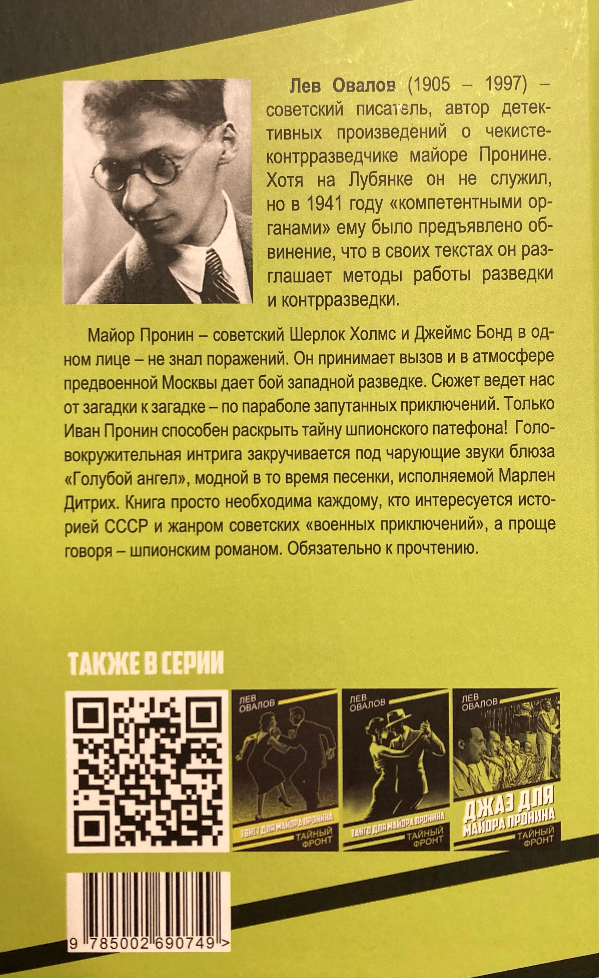 Майор Пронин – советский Шерлок Холмс и Джеймс Бонд в одном лице – не знал поражений. Он принимает вызов и в атмосфере предвоенной Москвы дает бой западной разведке. Сюжет ведет нас от загадки к загадке – по параболе запутанных приключений. Только Иван Пронин способен раскрыть тайну шпионского патефона! Головокружительная интрига закручивается под чарующие звуки блюза «Голубой ангел», модной в то время песенки, исполняемой Марлен Дитрих. Книга просто необходима каждому, кто интересуется историей СССР и жанром советских «военных приключений», а проще говоря – шпионским романом. Обязательно к прочтению.