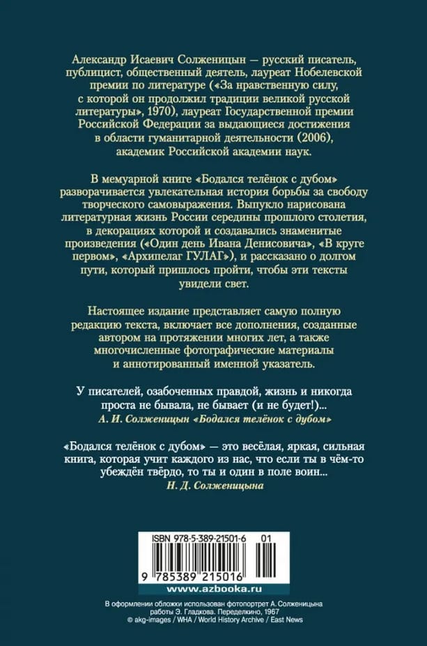 Александр Исаевич Солженицын — русский писатель, публицист, общественный деятель, лауреат Нобелевской премии по литературе («За нравственную силу, с которой он продолжил традиции великой русской литературы», 1970), лауреат Государственной премии Российской Федерации за выдающиеся достижения в области гуманитарной деятельности (2006), академик Российской академии наук. В мемуарной книге «Бодался телёнок с дубом» разворачивается увлекательная история борьбы за свободу творческого самовыражения. Выпукло нарисована литературная жизнь России середины прошлого столетия, в декорациях которой и создавались знаменитые произведения («Один день Ивана Денисовича», «В круге первом», «Архипелаг ГУЛАГ»), и рассказано о долгом пути, который пришлось пройти, чтобы эти тексты увидели свет. Настоящее издание представляет самую полную редакцию текста, включает все дополнения, созданные автором на протяжении многих лет, а также многочисленные фотографические материалы и аннотированный именной указатель.