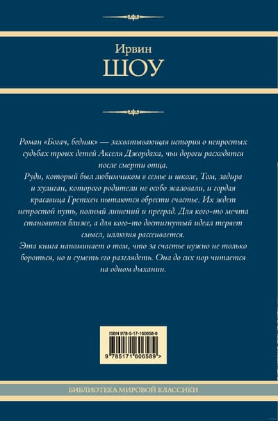 Роман «Богач, бедняк» — захватывающая история о непростых судьбах троих детей Акселя Джордаха, чьи дороги расходятся после смерти отца.