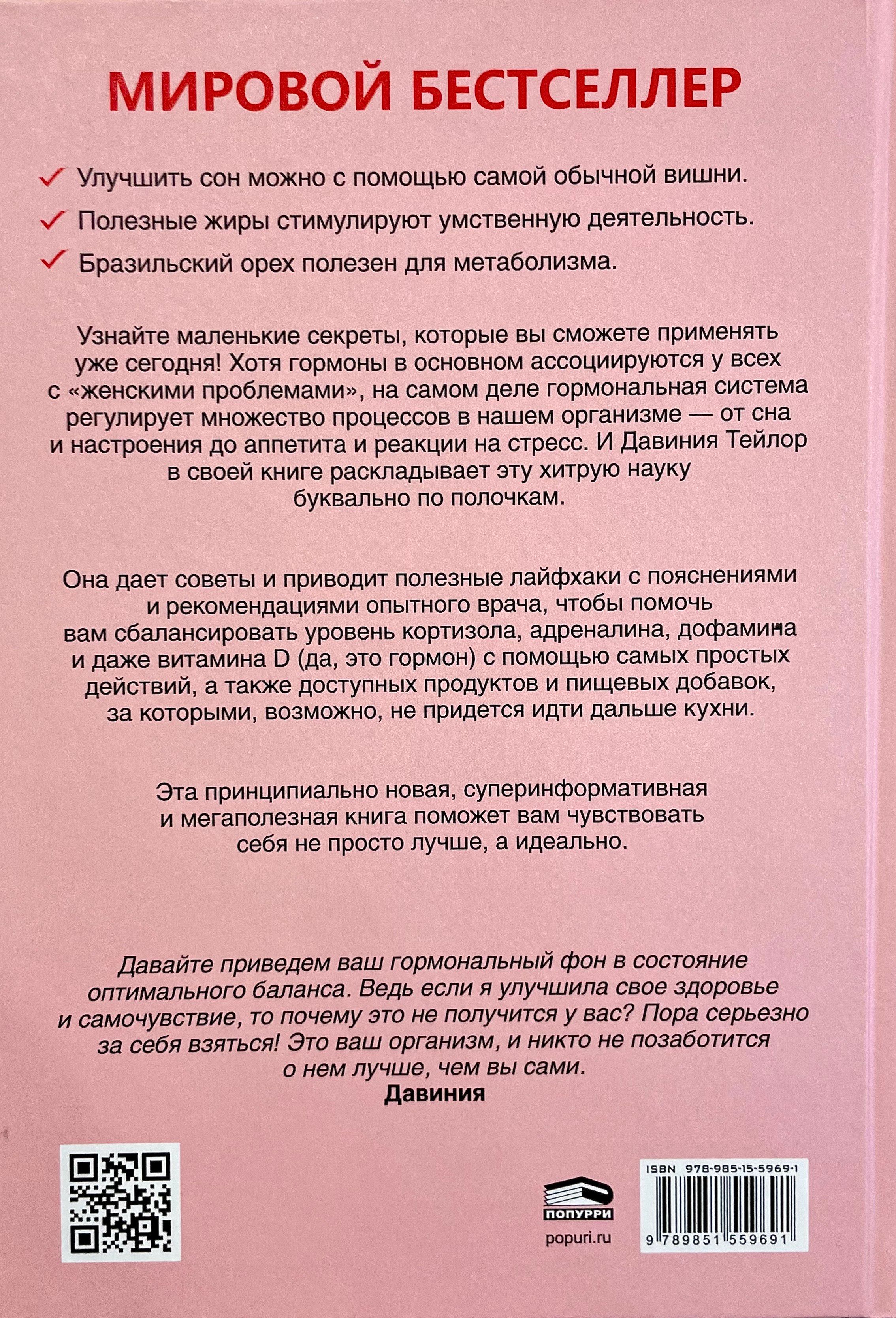 Узнайте маленькие секреты, которые вы сможете применять уже сегодня! Хотя гормоны в основном ассоциируются у всех с «женскими проблемами», на самом деле гормональная система регулирует множество процессов в нашем организме — от сна и настроения до аппетита и реакции на стресс. И Давиния Тейлор в своей книге раскладывает эту хитрую науку буквально по полочкам.