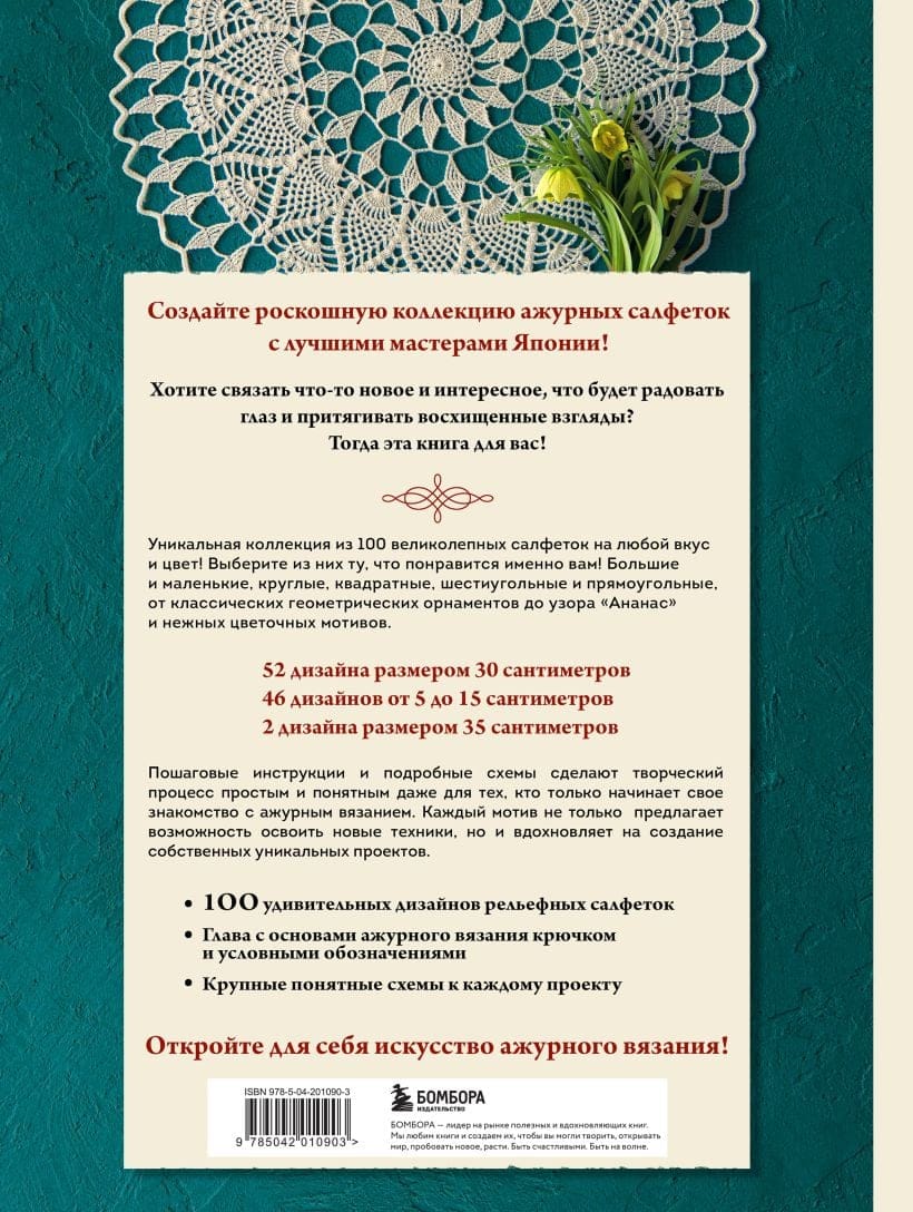 Хотите связать что-то новое и интересное, что будет радовать глаз и притягивать восхищенные взгляды? Тогда эта книга для вас! Лучшие японские мастера представляют уникальную коллекцию из 100 ажурных салфеток, которые украсят ваш дом или станут прекрасным подарком. 52 крупные салфетки, 46 миниатюрных и 2 эксклюзивные: большие и маленькие, круглые, квадратные и шестиугольные, с классическими орнаментами, узором «Ананас» и цветочными мотивами — выберите дизайн, который понравится именно вам!