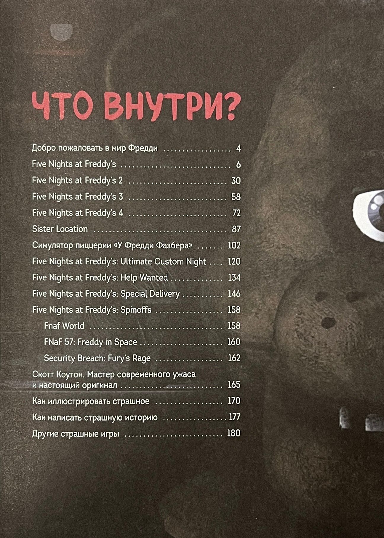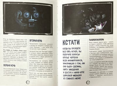 Внутри в стиле ФНАФ — мрачно, много черного цвета, местами пугающе! В этой книге: прохождение, особенности аниматроников, подсказки о том, как рисовать персонажей, как написать собственную страшную историю, примеры хоррор-игр, которые могут быть интересны геймерам. Чем отличается от других гайдов по ФНАФ: подойдет для начинающего игрока, фаната компьютерных игр и аниматроников. Всё подробно, простым языком, персонажи крупно. Отличная новинка к коллекции книг серии Five Nights at Freddy’s!