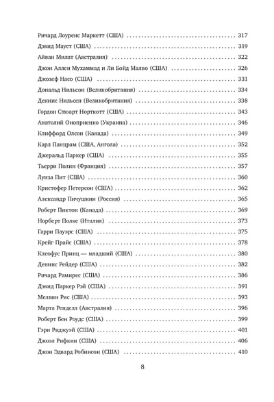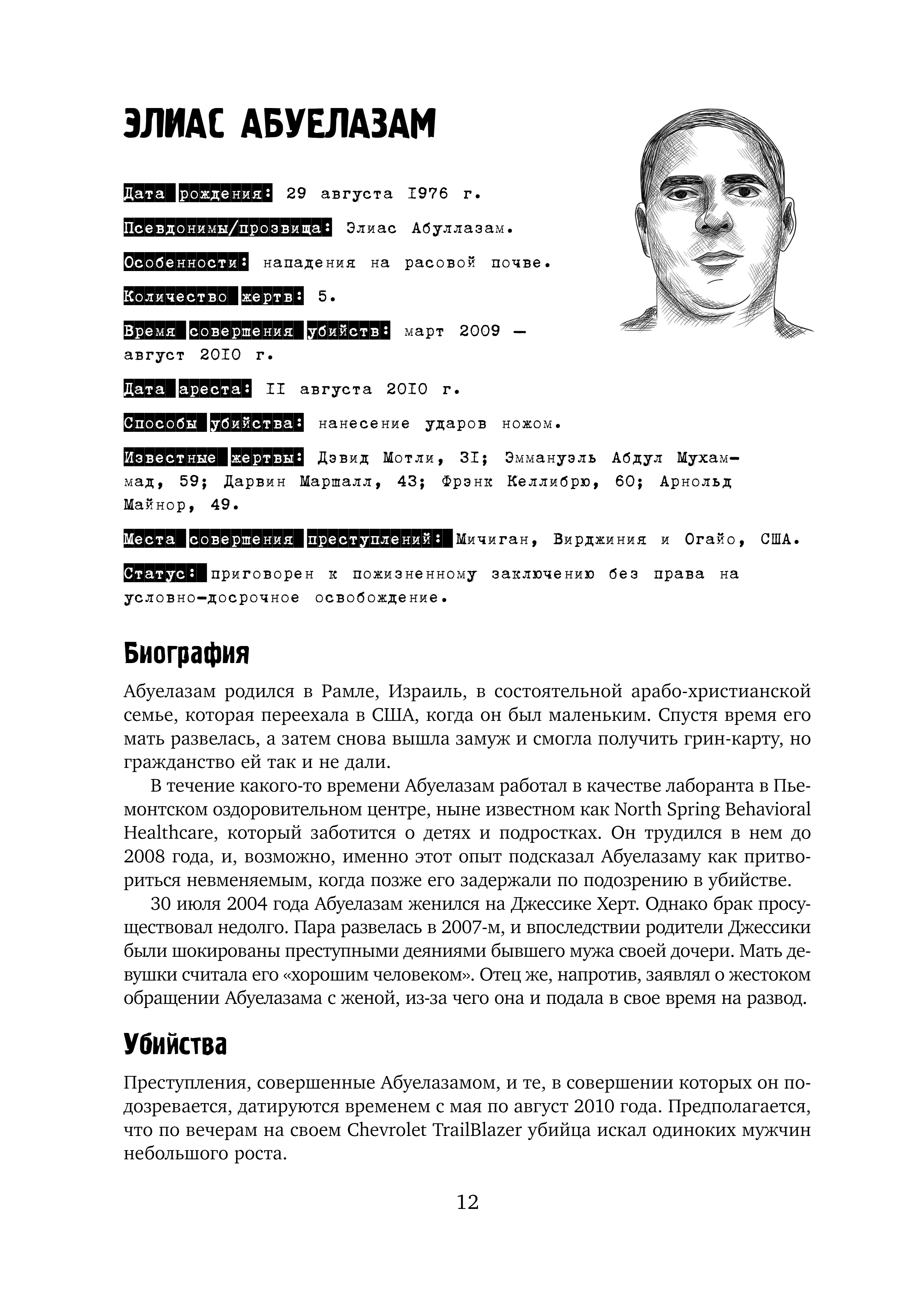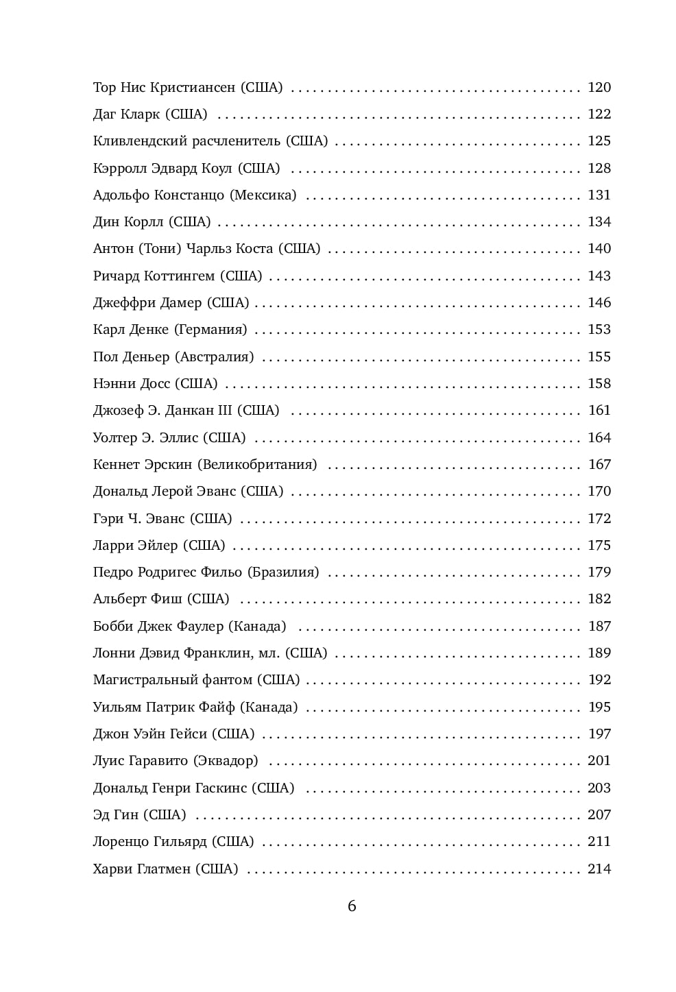 Вас ждет широкий выбор историй: влюбленные сообщники, серийные отравительницы, случайные попутчики, жуткие незнакомцы, жестокие каннибалы. Здесь собраны биографии как пойманных серийных убийц, так и тех, кого до сих пор ищут. Истории женщин-маньяков, загадочные преступления XIX века и свежие жутчайшие дела.