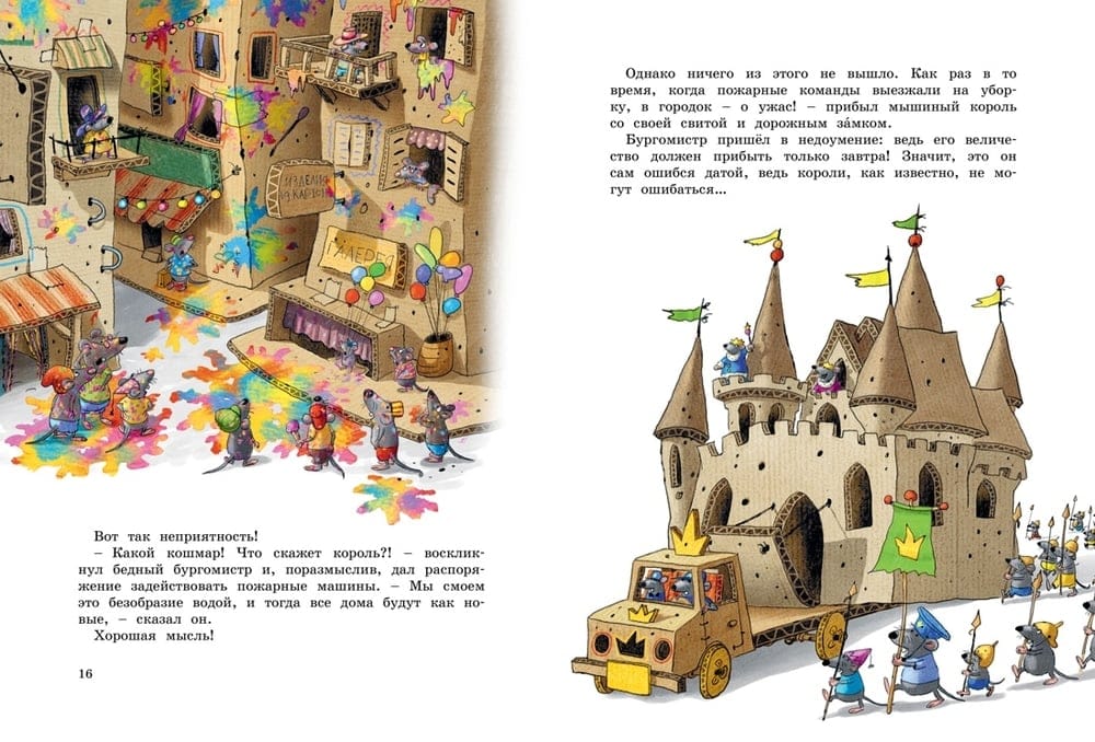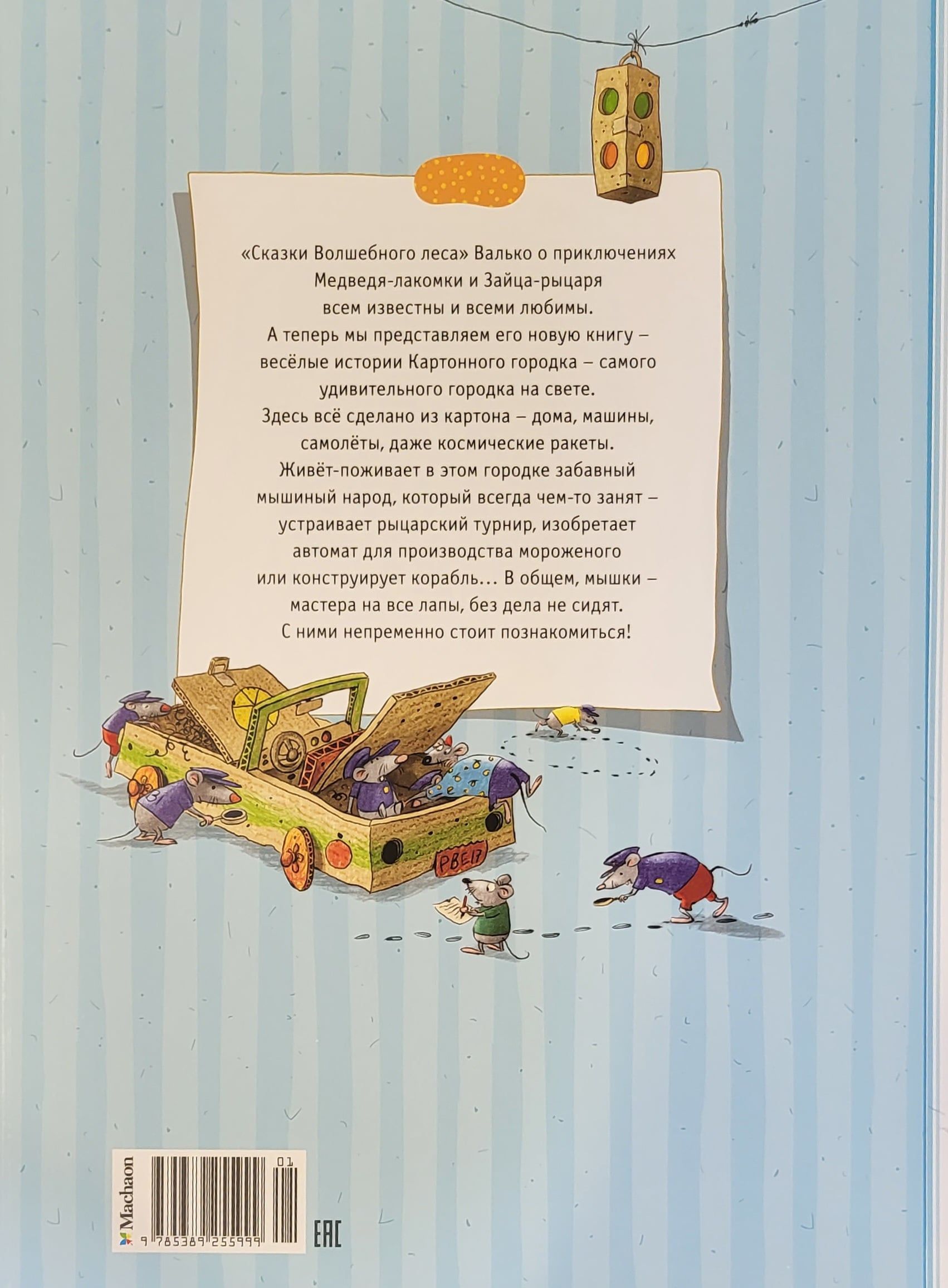 «Сказки Волшебного леса» Валько о приключениях Медведя-лакомки и Зайца-рыцаря всем известны и всеми любимы. А теперь мы представляем его новую книгу – весёлые истории Картонного городка – самого удивительного городка на свете. Здесь всё сделано из картона – дома, машины, самолёты, даже космические ракеты. Живёт-поживает в этом городке забавный мышиный народ, который всегда чем-то занят – устраивает рыцарский турнир, изобретает автомат для производства мороженого или конструирует корабль... В общем, мышки – мастера на все лапы, без дела не сидят. С ними непременно стоит познакомиться!
