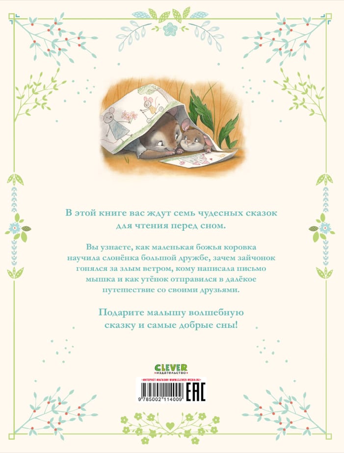 В этой книге вас ждут семь чудесных сказок для чтения перед сном. Вы узнаете, как маленькая божья коровка научила слонёнка большой дружбе, зачем зайчонок гонялся за злым ветром, кому написала письмо мышка и как утёнок отправился в далёкое путешествие со своими друзьями.