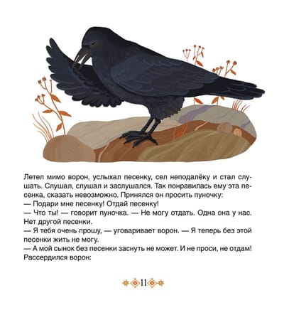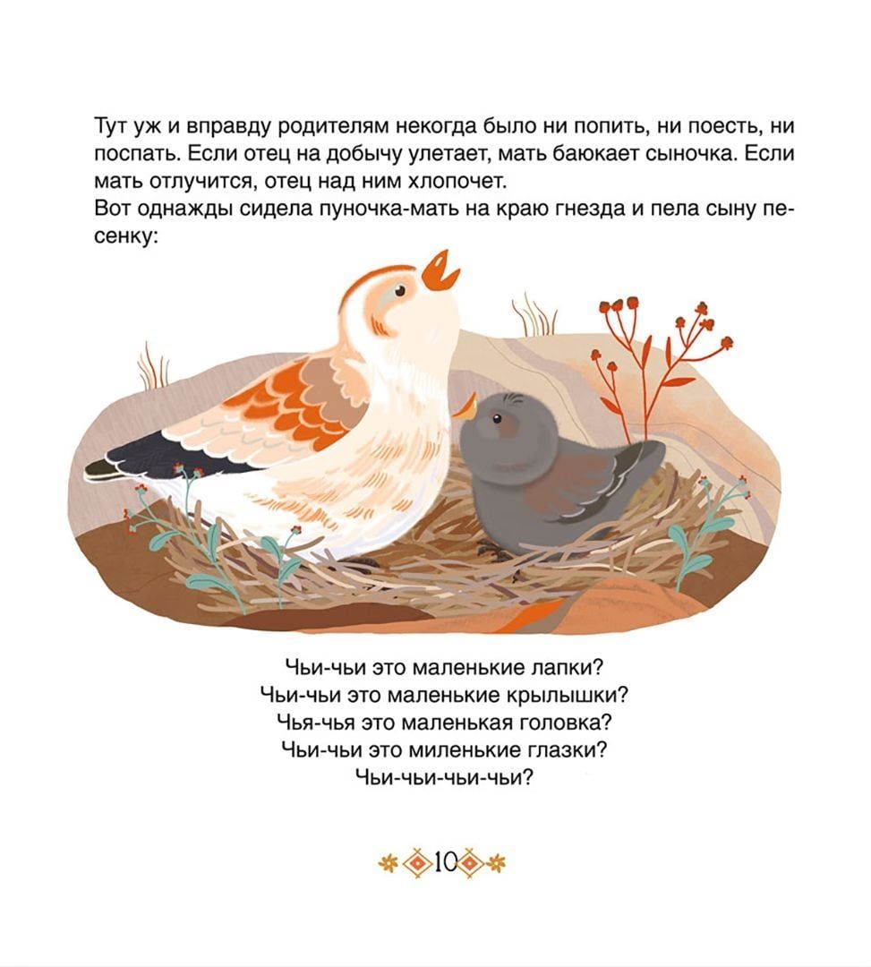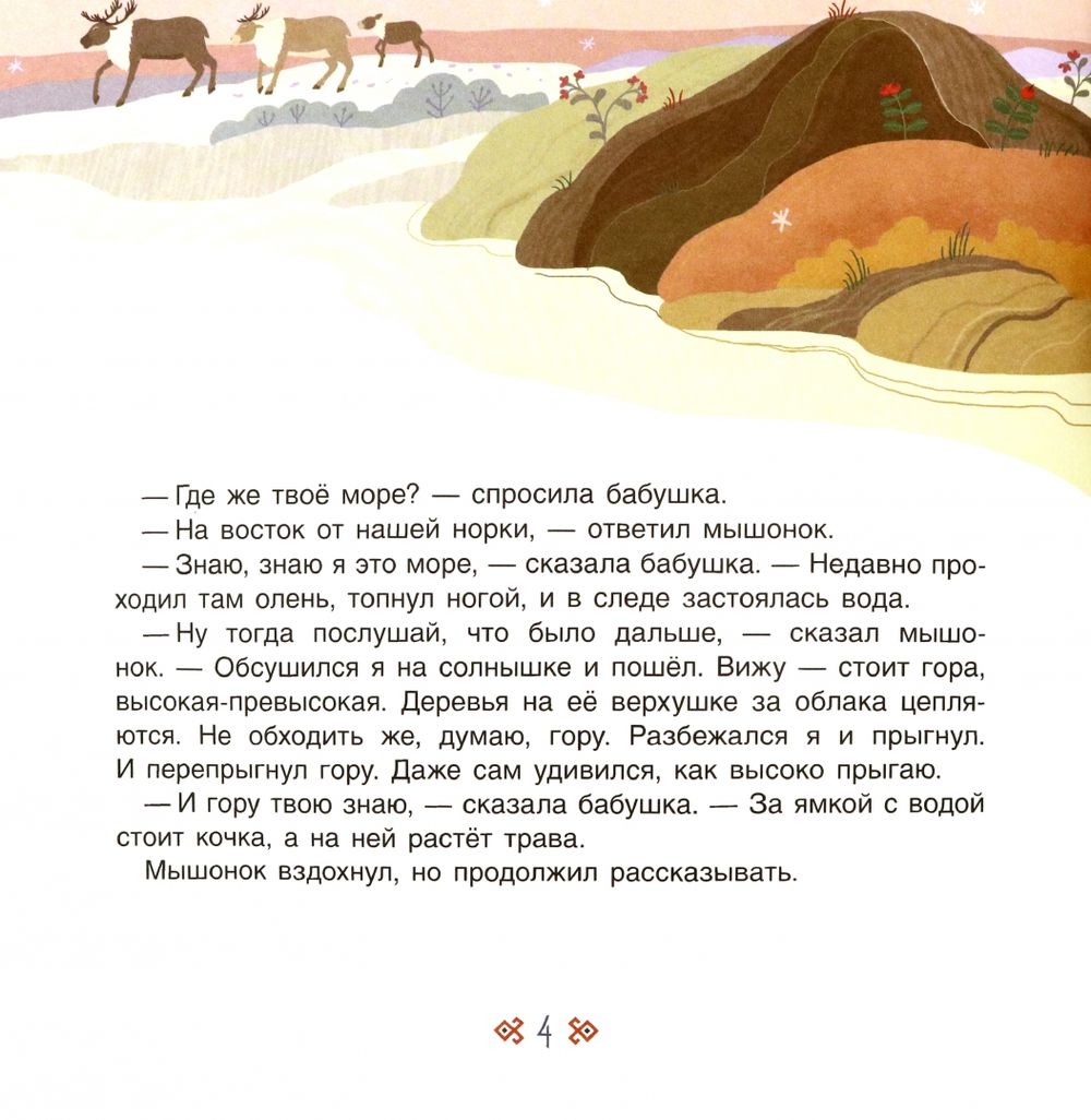 Дорогой читатель, сказки народов Севера раскрывают большой яркий мир, в котором древние верования, волшебные герои, повседневный быт и потусторонний мир взаимодействуют, пересекаются и сливаются в дивные полотна. Читайте эти сказки не спеша, с остановками, обсуждайте героев, образ их жизни и мыслей, их действия, непонятные маленьким слушателям и читателям слова и образы. Представляйте себя на месте героев и их спутников. Рассматривайте и обсуждайте иллюстрации. Обсуждайте, чему учит каждая из сказок. Ведь сказки – своего рода подготовка к жизни. И, возможно, и тем, кто их читает, сам станет однажды похож на смелого маленького мышонка, самостоятельно познающего огромный мир, или на медвежонка, умеющего ценить дружбу, или на отважную крохотную птичку-пуночку, ради своего птенчика победившую огромного злого ворона.