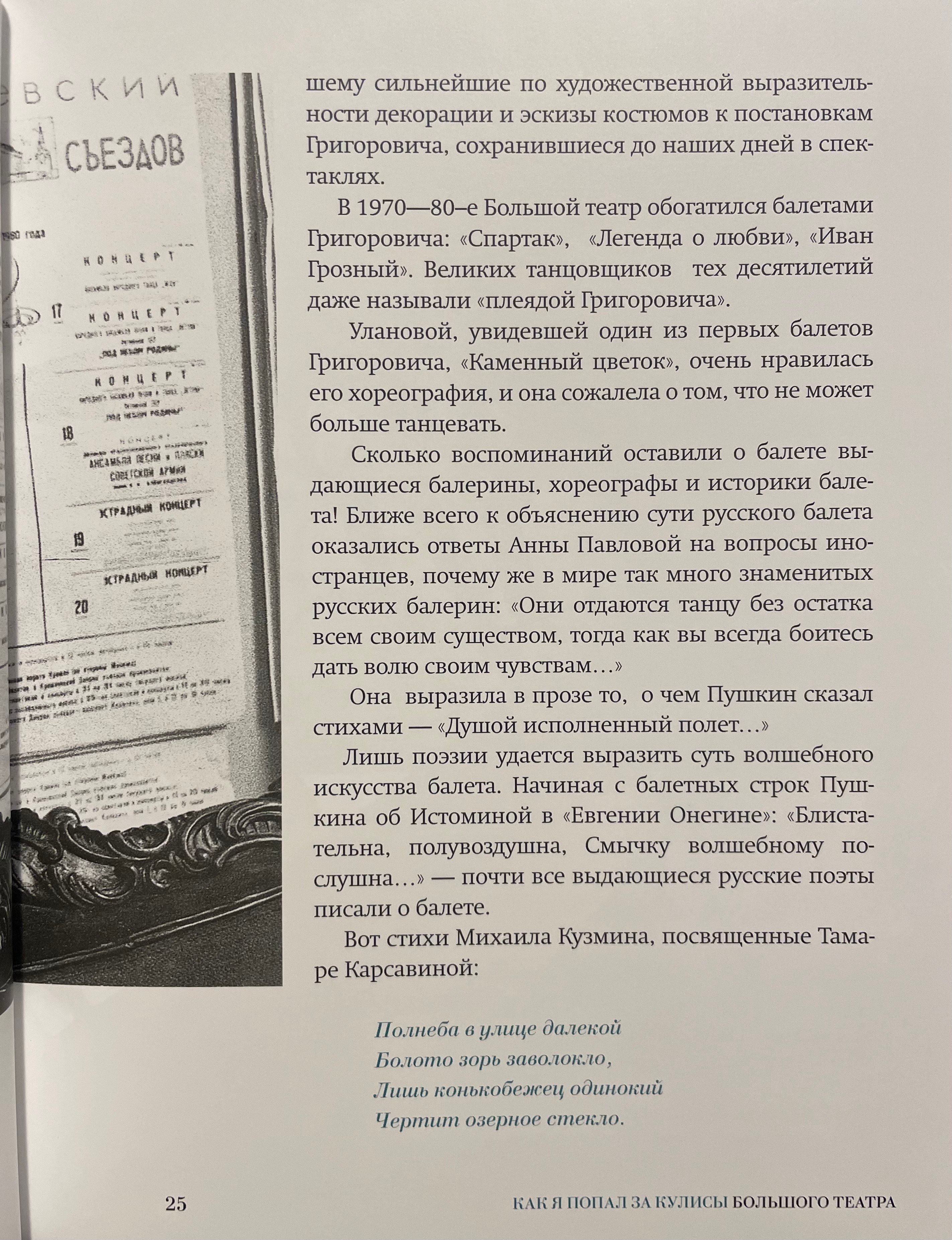 В книге Григорий Верховский рассказывает, как ему удалось побывать буквально в каждом уголке театра — в классах и на репетициях, в костюмерных и в гримерных выдающихся танцовщиков, и