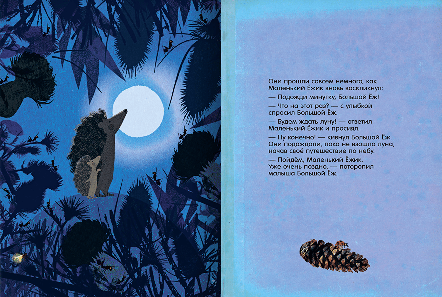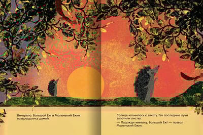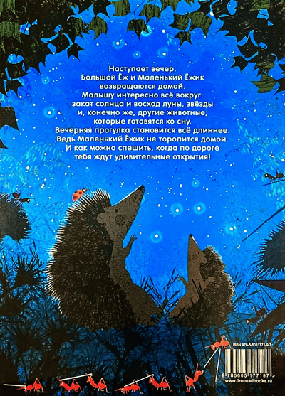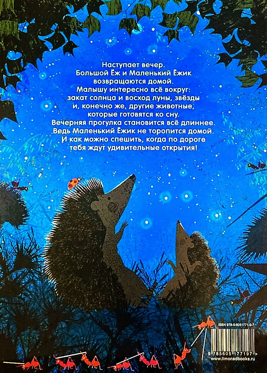 Наступает вечер. Большой Ёж и Маленький Ёжик возвращаются домой. Малышу интересно всё вокруг: закат солнца и восход луны, звёзды и, конечно же, другие животные, которые готовятся ко сну. Вечерняя прогулка становится всём длиннее. Ведь Маленький Ёжик не торопится домой. И как можно спешить, когда по дороге тебя ждут удивительные открытия!