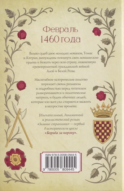 Февраль 1460 года. Волею судеб двое молодых монахов, Томас и Кэтрин, вынуждены покинуть свои монашеские ордена и бежать через всю страну, охваченную кровопролитной гражданской войной Алой и Белой Розы. Масштабное историческое полотно поражает своим размахом и подробностью: перед читателем разворачиваются и политические интриги, и будни обычных людей, которые изо всех сил стараются выжить в непростые времена. Увлекательный, динамичный и реалистический роман «Зимние странники» – первый в историческом цикле «Борьба за корону».