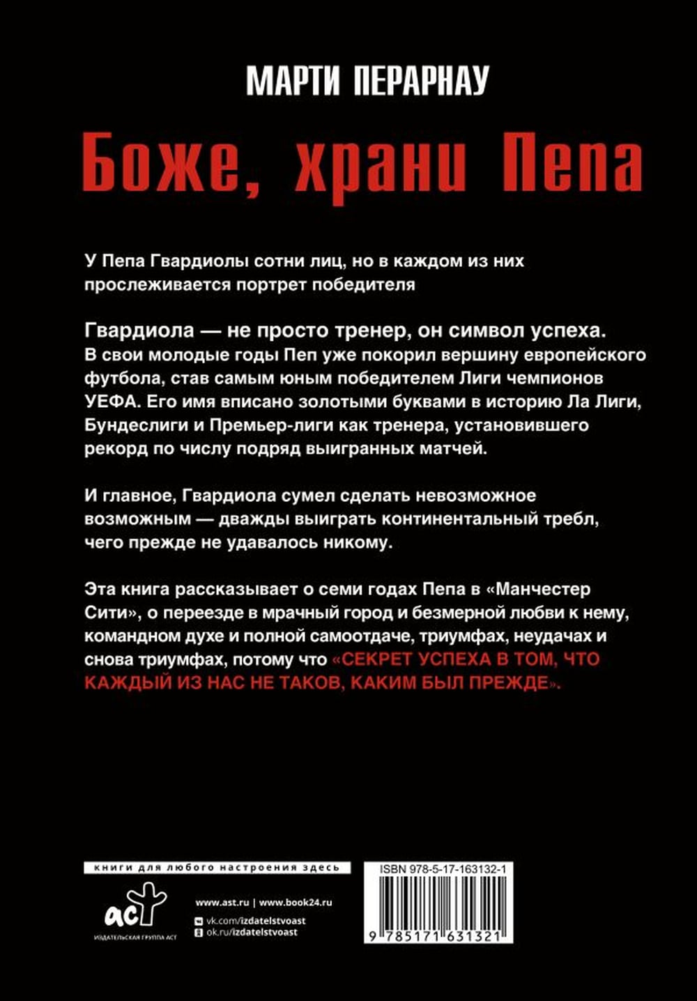 У Пепа Гвардиолы сотни лиц, но в каждом из них прослеживается портрет победителя. Гвардиола — не просто тренер, он символ успеха. В свои молодые годы Пеп уже покорил вершину европейского футбола, став самым юным победителем Лиги чемпионов УЕФА. Его имя вписано золотыми буквами в историю Ла Лиги, Бундеслиги и Премьер-лиги как тренера, установившего рекорд по числу подряд выигранных матчей. И главное, Гвардиола сумел сделать невозможное возможным — дважды выиграть континентальный требл, чего прежде не удавалось никому. Эта книга рассказывает о семи годах Пепа в «Манчестер Сити», о переезде в мрачный город и безмерной любви к нему, командном духе и полной самоотдаче, триумфах, неудачах и снова триумфах, потому что «Секрет успеха в том, что каждый из нас не таков, каким был прежде».