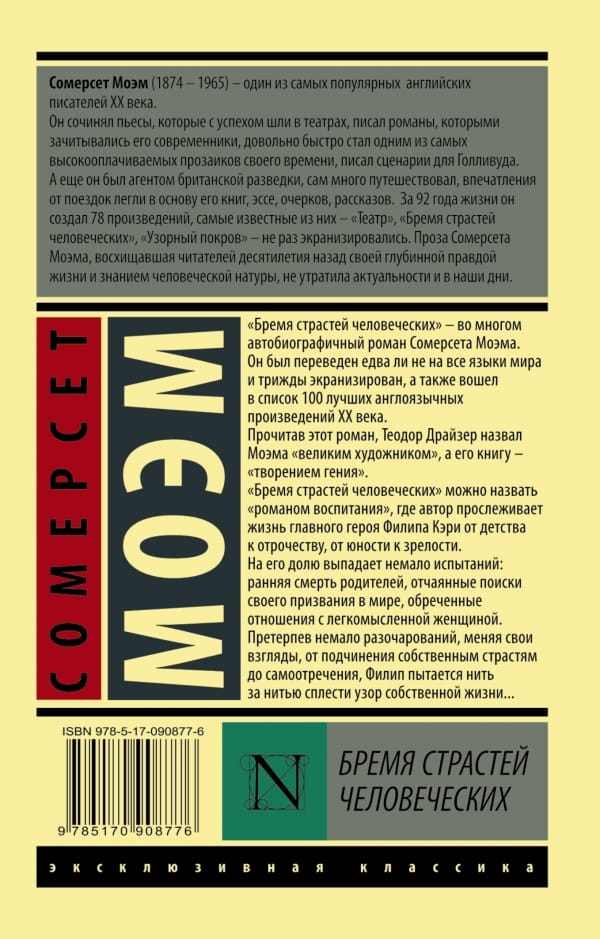 «Бремя страстей человеческих» — во многом автобиографичный роман Сомерсета Моэма. Он был переведен едва ли не на все языки мира и трижды экранизирован, а также вошел в список 100 лучших англоязычных произведений XX века. Прочитав этот роман, Теодор Драйзер назвал Моэма «великим художником», а его книгу — «творением гения». «Бремя страстей человеческих» можно назвать «романом воспитания», где автор прослеживает жизнь главного героя Филипа Кэри от детства к отрочеству, от юности к зрелости. На его долю выпадает немало испытаний: ранняя смерть родителей, отчаянные поиски своего призвания в мире, обреченные отношения с легкомысленной женщиной. Претерпев немало разочарований, меняя свои взгляды, от подчинения собственным страстям до самоотречения, Филип пытается нить за нитью сплести узор собственной жизни…