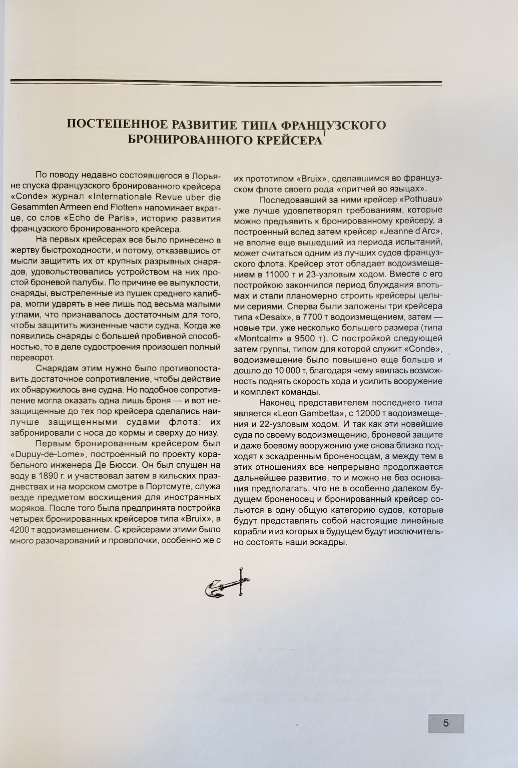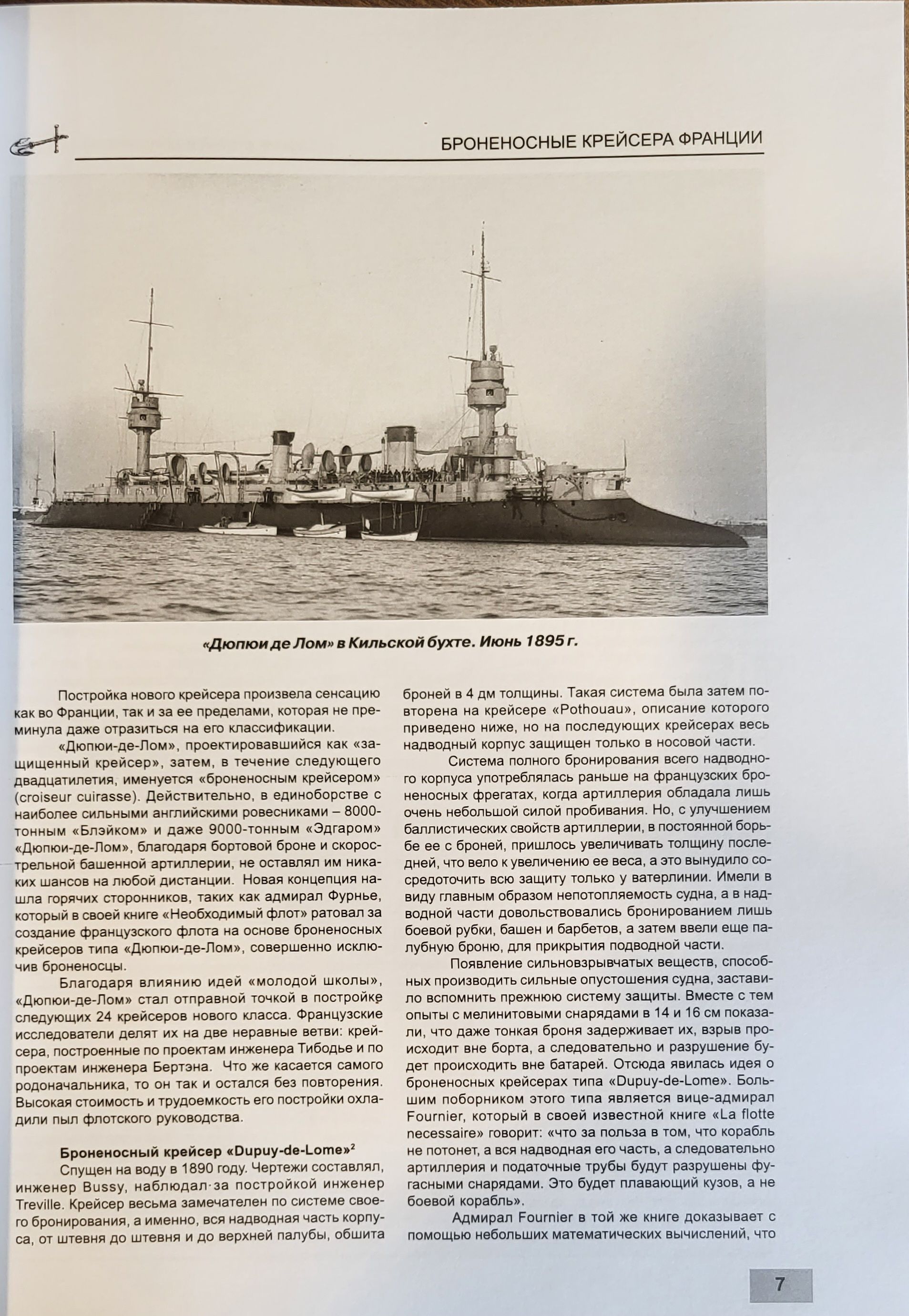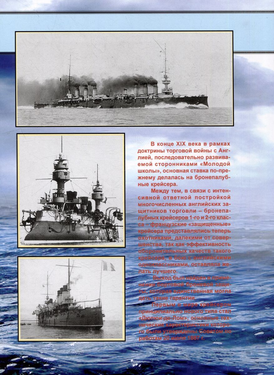 Первым бронированным крейсером был «‎Dupuy-de-Lome»‎, построенный по проекту корабельного инженера Де Бюсси. Он был спущен на воду в 1890 г. и участвовал затем в кильских празднествах и на морском смотре в Портсмуте, служа везде предметом восхищения для иностранных моряков.