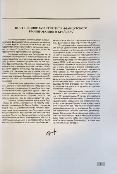 На первых крейсерах Франции все было принесено в жертву быстроходности, и потому, отказавшись от мысли защитить их от крупных разрывных снарядов, удовольствовались устройством на них простой броневой палубы. По причине ее выпуклости снаряды, выстреленные из пушек среднего калибра, могли ударять в нее лишь под весьма малыми углами, что признавалось достаточным для того, чтобы защитить жизненные части судна. Когда же появились снаряды с большей пробивной способностью, то в деле судостроения произошел полный переворот. Снарядам этим нужно было противопоставить достаточное сопротивление, чтобы действие их обнаружилось вне судна. Но подобное сопротивление могла оказать одна лишь броня - и вот незащищенные до тех пор крейсера сделались наилучше защищенными судами флота: их забронировали с носа до кормы и сверху до низу.