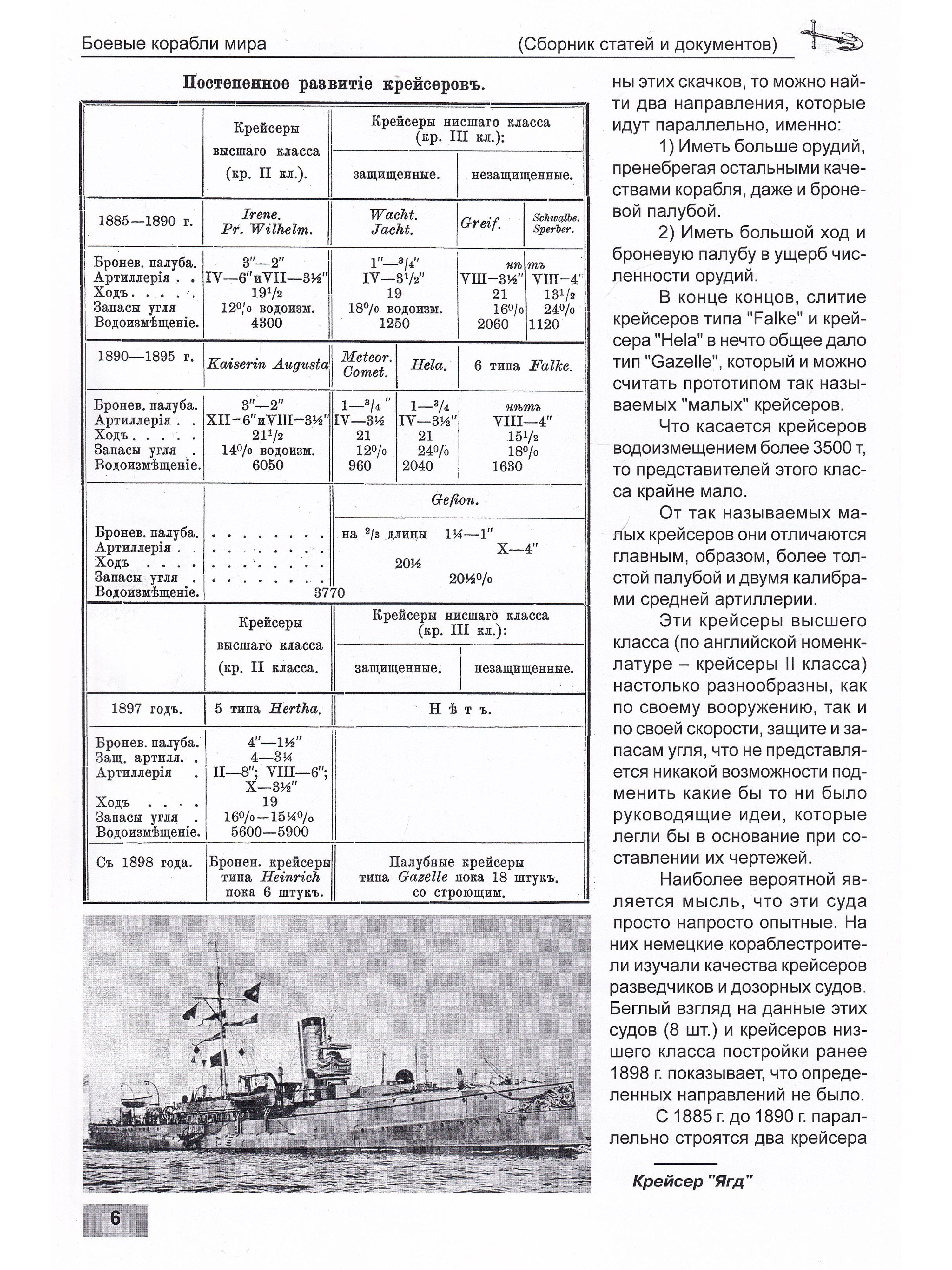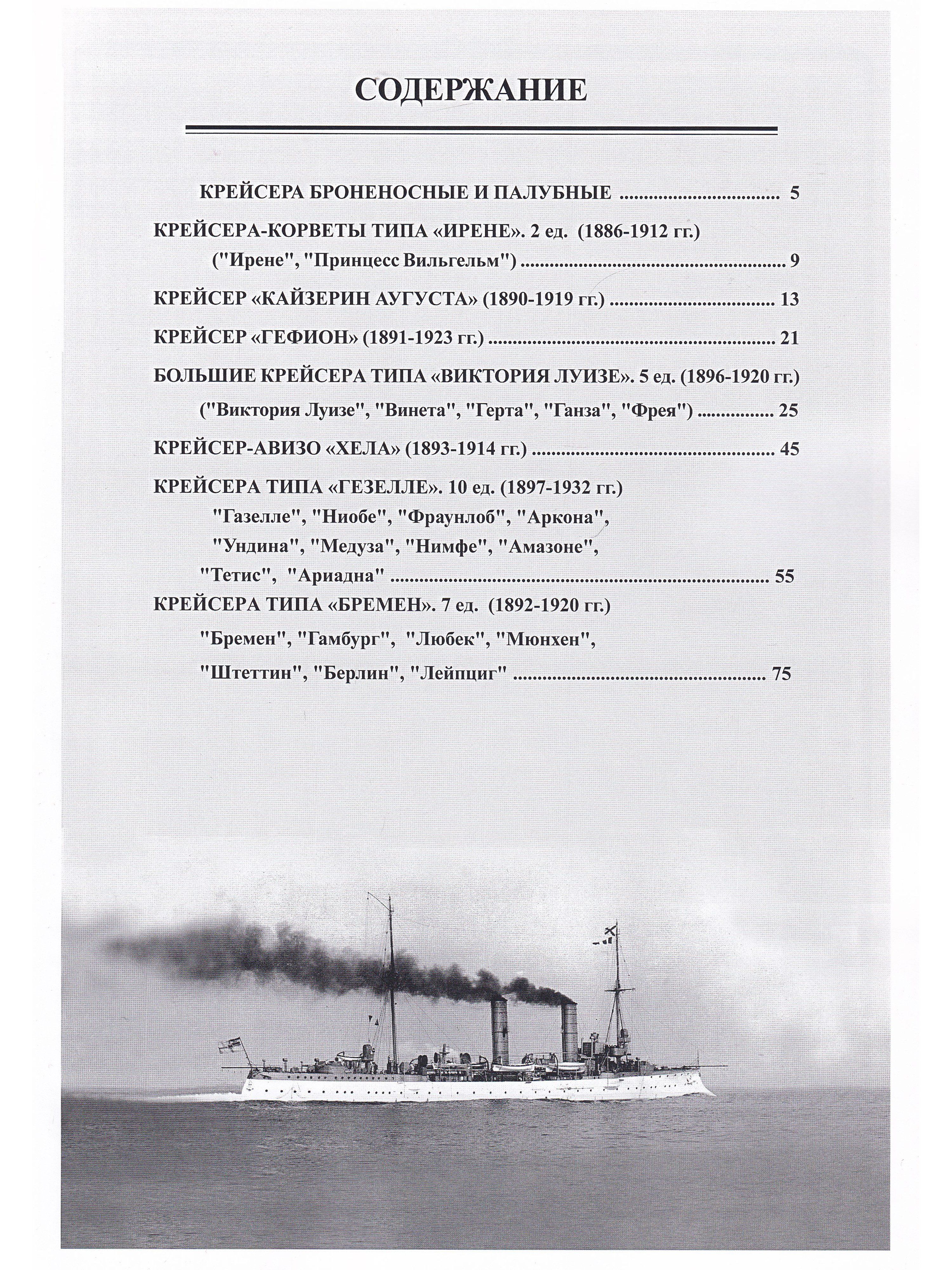 Книга посвящена истории проектирования, строительства и боевой службы бронепалубных крейсеров Германии, построенных в период с конца 1880-х гг. до 1906 гг. В первой части рассматриваются крейсера типов «‎Ирене»‎, «‎Кайзерин Аугуста»‎, «‎Гефион»‎, «‎Виктория Луизе»‎, «‎Хела»‎, «‎Газелле»‎ и «‎Бремен»‎; во второй части рассматриваются крейсера типов «‎Кенигсберг»‎, «‎Дрезден»‎, «‎Кольберг»‎ и «‎Пиллау»‎.