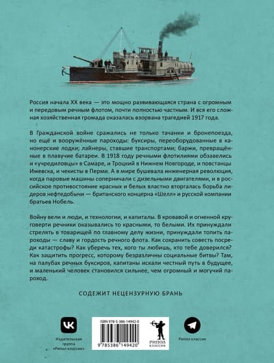 В 1918 году речными флотилиями обзавелись и «учредиловцы» в Самаре, и Троцкий в Нижнем Новгороде, и повстанцы Ижевска, и чекисты в Перми. А в мире бушевала инженерная революция, когда паровые машины соперничали с дизельными двигателями, и в российское противостояние красных и белых властно вторгалась борьба лидеров нефтедобычи — британского концерна «Шелл» и русской компании братьев Нобель. Войну вели и люди, и технологии, и капиталы. В кровавой и огненной круговерти речники оказывались то красными, то белыми. Их принуждали стрелять в товарищей по главному делу жизни, принуждали топить пароходы — славу и гордость речного флота. Как сохранить совесть посреди катастрофы? Как уберечь тех, кого ты любишь, кто тебе доверился? Как защитить прогресс, которому безразличны социальные битвы? Там, на палубах речных буксиров, капитаны искали честный путь в будущее, и маленький человек становился сильнее, чем огромный и могучий пароход.