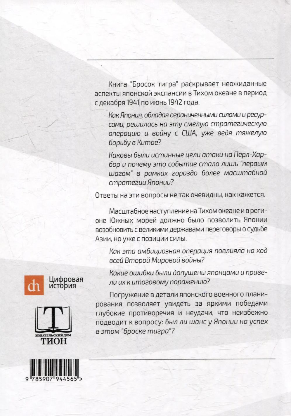 Книга «Бросок тигра» раскрывает неожиданные аспекты японской экспансии в Тихом океане в период с декабря 1941 по июнь 1942 года. Как Япония, обладая ограниченными силами и ресурсами, решилась на смелую стратегическую операцию, которая начала Вторую мировую войну для США и их союзников? Каковы были истинные цели атаки на Перл-Харбор и почему это событие стало лишь «первым шагом» в гораздо более масштабной стратегии Японии? Ответы на эти вопросы не так очевидны, как кажется.