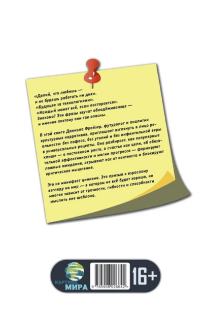 В этой книге Даниэла Фрейзер, футуролог и аналитик культурных нарративов, приглашает взглянуть в лицо реальности: без пафоса, без утопий и без инфантильной веры в универсальные рецепты. Она разбирает, как популярные клише о постоянном росте, о счастье как цели, об обязательной эффективности и магии прогресса формируют ложные ожидания, отрывают нас от контекста и блокируют критическое мышление. Это не манифест цинизма. Это призыв к взрослому взгляду на мир в котором не всё будет хорошо, но многое зависит от трезвости, гибкости и способности мыслить вне шаблона.