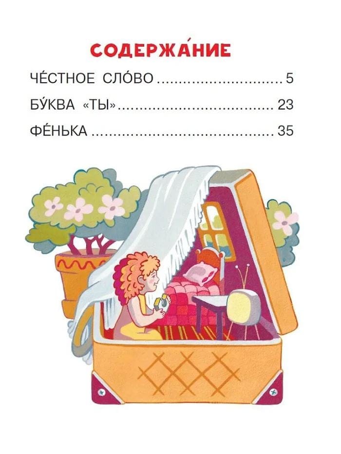 В книгу вошли три увлекательных рассказа Леонида Пантелеева: история о силе обещания «Честное слово», забавный рассказ о девочке Иринушке и сложной букве «ТЫ» и сказка «Фенька» — о крошечной девочке с удивительными способностями. Герои научат юных читателей честности, доброте и дружбе. А крупные буквы и ударения позволят малышам самостоятельно познакомиться с увлекательным произведением.