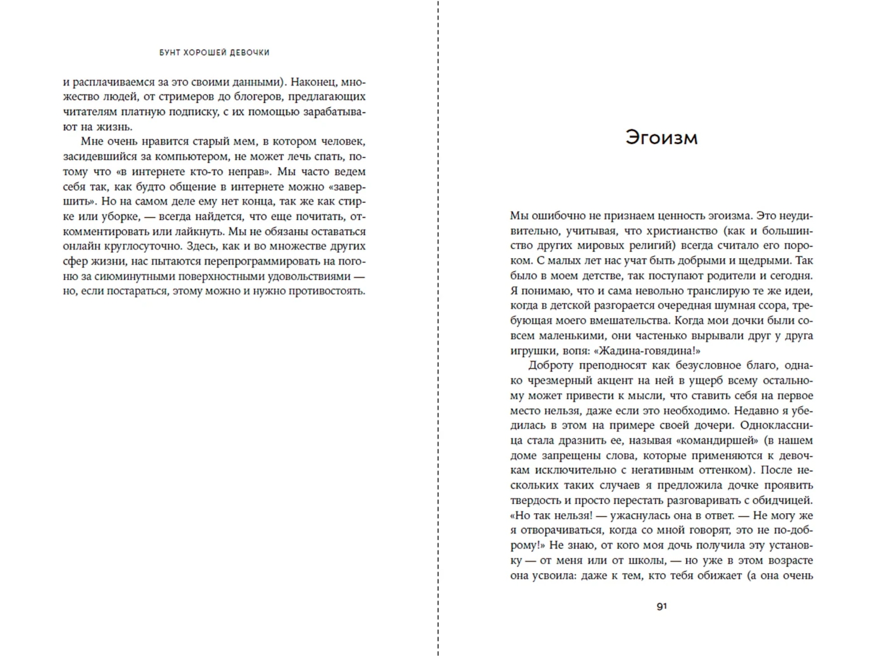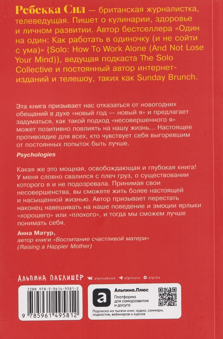 Еще с детства нам внушают, что быть хорошей — значит быть спокойной, покладистой и аккуратной. Мудрые и доброжелательные люди предлагают помочь нам стать достойными, позитивными, продуктивными и всегда готовыми ответить «да, я справлюсь!». Но чаще всего постоянное стремление быть лучше и соответствовать требованиям общества выматывает и разрушает нас. Ребекка Сил, британская журналистка и писательница, ставит перед читателем радикальные и неудобные вопросы о принятии себя, собственных несовершенств и отказе от навязанного обществом культа успеха, продуктивности и внешнего совершенства. Автор предлагает пересмотреть традиционные представления о таких «пороках», как лень, тревожность и излишняя эмоциональность, утверждая, что эти качества могут быть очень полезны. Она не призывает резко стать плохой и неудобной, а скорее предлагает задуматься, как принять каждую часть себя, не подстраиваясь под шаблоны, созданные обществом.