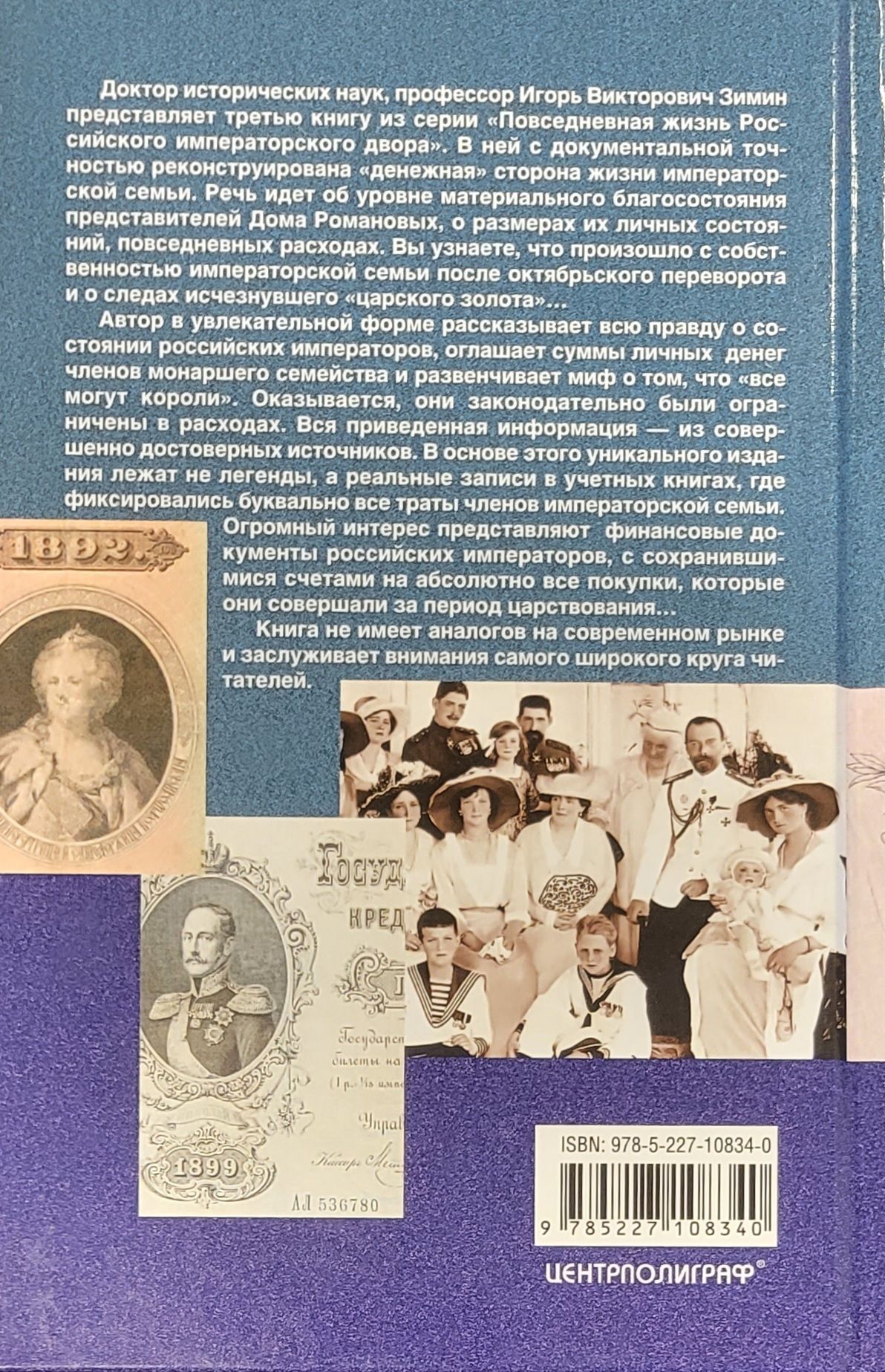 Доктор исторических наук, профессор Игорь Викторович Зимин представляет третью книгу из серии «Повседневная жизнь Российского императорского двора». В ней с документальной точностью реконструирована «денежная» сторона жизни императорской семьи. Речь идет об уровне материального благосостояния представителей Дома Романовых, о размерах их личных состояний, повседневных расходах. Вы узнаете, что произошло с собственностью императорской семьи после октябрьского переворота и о следах исчезнувшего «царского золота»… Книга не имеет аналогов на современном рынке и заслуживает внимания самого широкого круга читателей.