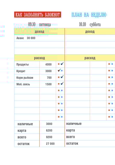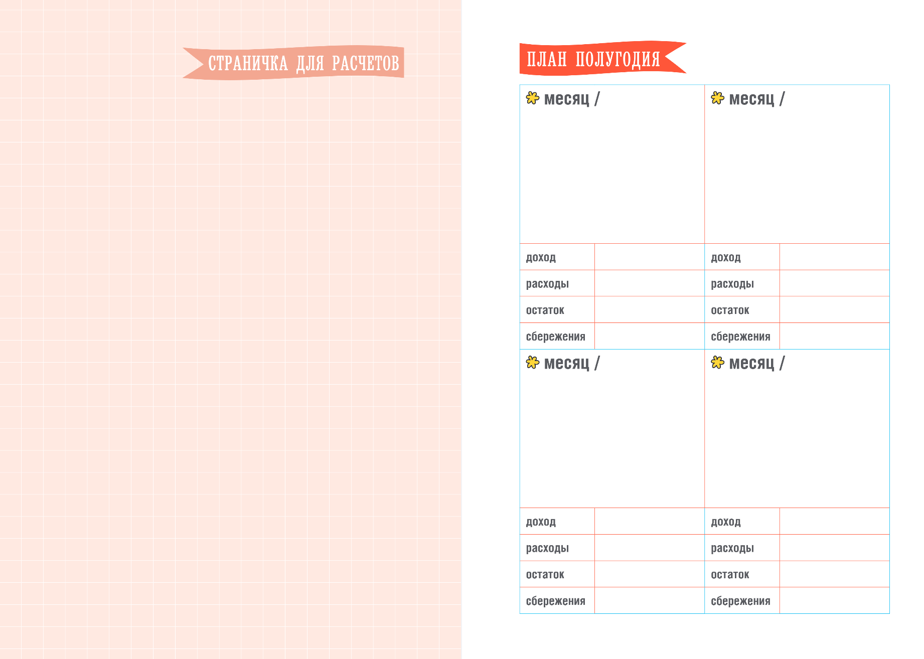 В конце месяца сложно вспомнить, на что ушли деньги. Покупали еду, в кино сходили, машину заправили. Хорошо, а куда еще? С блокнотом «Твои доходы и расходы» вы научитесь считать свои финансы. Мы создали для вас максимально продуманную концепцию для экономии ваших денег. Заполняйте странички, считайте доходы и расходы, отмечайте, что вы купили и как расплатились. Подводите итоги недели, месяца и, конечно, планируйте вперед. Попробуйте, это очень удобно!