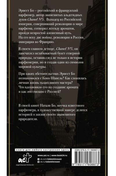 В своем главном детище, Chanel No.5, он запечатлел незабываемый букет северной природы, оставив след не только в истории парфюмерии, но и создав один из символов мировой культуры. При каких обстоятельствах Эрнест Бо познакомился с Коко Шанель? Как сложилась личная жизнь талантливого мастера? Что вдохновило его на создание аромата и как это связано с Россией? На эти и многие другие вопросы ответит автор книги Натали Бо – внучка известного парфюмера.