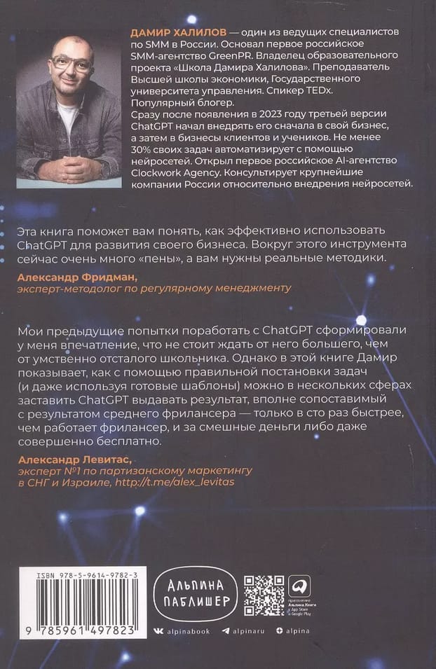 Дамир Халилов один из первых в России не только начал использовать нейросети для автоматизации своей работы, но и стал обучать этому других. В своей книге он рассказывает, как использовать ChatGPT и другие ИИ-инструменты для бизнеса и маркетинга. В основе издания — 333 готовых промта, разработанных автором по собственной методике с учетом особенностей работы нейросетей и проверенных на множестве реальных проектов. Эти промты позволяют создавать наиболее актуальные бизнес- и маркетинговые материалы — от постов в соц сетях до комплексных стратегических документов. Особое внимание уделяется структуре и элементам промтов, от которых зависит качество ответов нейросети.