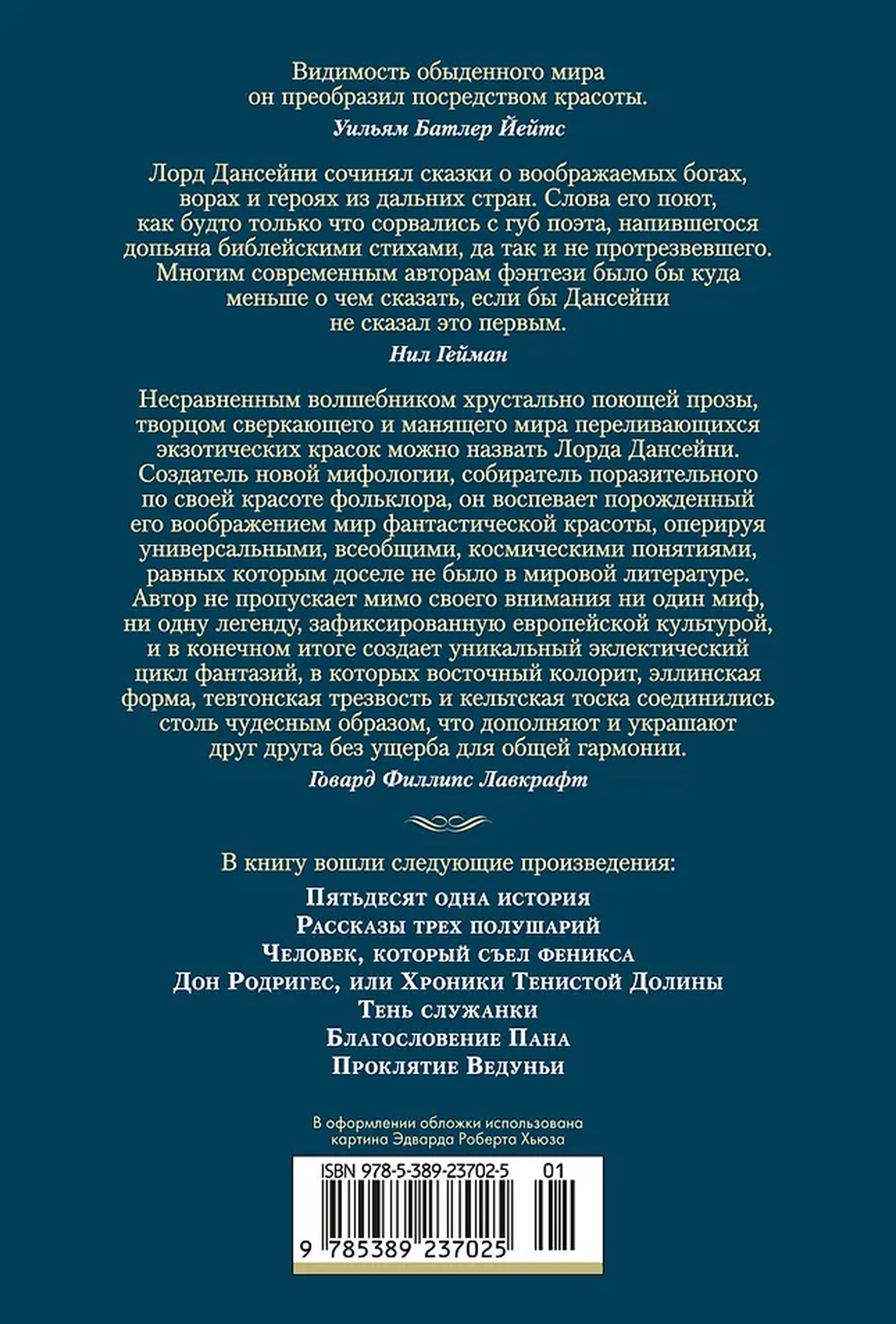 Эдвард Джон Мортон Дракс Планкетт, 18-й барон Дансейни, публиковавшийся как лорд Дансейни, — знаменитый автор множества романов, пьес и литературных сказок, стоявший у истоков самого жанра фэнтези. Едва ли не первым в европейской литературе он создал целый «вторичный мир» — со своей космологией, мифологией, историей и географией. Его мифология повлияла на Лавкрафта, Толкина и Борхеса, а парадоксальный юмор, постоянная игра с читательскими ожиданиями — на Нила Геймана и на всю современную ироническую фэнтези.