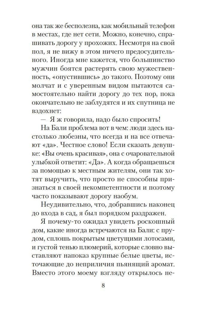 Каждый человек мечтает обрести счастье. Но порой эта мечта так никогда и не воплощается в жизнь. Нам постоянно мешают какие-то внешние обстоятельства, на первый взгляд непреодолимые. Юлиан, герой романа Гунеля, молод, здоров, хорош собой и… отчаянно недоволен своей жизнью, хотя объективно ему ничто не мешает быть счастливым. Оказавшись на Бали, он попадает в затерянную среди тропических лесов деревеньку, где знакомится со стариком-целителем по имени Сантьянг. О нем на острове ходят легенды. Мудрый старец врачует не тело, а душу человека. И ему ведома истина, способная изменить весь мир вокруг нас: то, во что мы верим, становится нашей реальностью и определяет нашу жизнь.Книга Лорана Гунеля, входящего в пятерку самых популярных беллетристов Франции. стала всемирным бестселлером, несколько лет возглавляла топ-листы продаж во Франции и была переведена на двадцать пять языков.