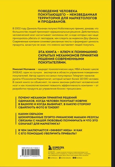 Поведение человека покупающего — неизведанная территория для маркетологов и продаванов. В 2002 году Даниэль Канеман получил Нобелевскую премию, доказав, что большинство людей принимают иррациональные решения. Действительно, эволюция человеческого мозга насчитывает миллионы лет, в ходе которых нам чаще приходилось убегать от леопардов, чем следить за индексом Доу-Джонса. Современные компании сочиняют рекламные тексты и формируют ценность продукта, зачастую не зная, что именно заставляет людей покупать. Эта книга — ключ к пониманию скрытых механизмов принятия решения современными покупателями. Николай Молчанов — кандидат психологических наук, MBA в бизнес-школе INSEAD, один из лучших экспертов в области управления поведением покупателей. Автор одного из самых популярных Telegram-каналов Рунета «Психология маркетинга», который читают более 60 000 человек. В своей книге он объясняет, по каким законам работает человеческий мозг и как психология поможет повысить эффективность компании — от разработки продукта до управления бизнес-процессами. • Почему механизм принятия решений одинаков, когда человек покупает коврик в ванную и когда выбирает, в какую сторону свайпнуть фото в Tinder? • Каким образом шокированные пуэрториканские макаки-резусы связаны с нашей любовью поумничать и что это означает для маркетинга? • В чем заключается «эффект ИКЕА» и как с помощью него увеличить прибыль?