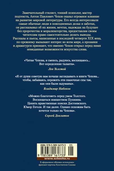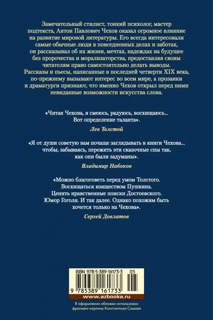 Замечательный стилист, тонкий психолог, мастер подтекста, Антон Павлович Чехов оказал огромное влияние на развитие мировой литературы. Его всегда интересовали самые обычные люди в повседневных делах и заботах, он рассказывал об их жизни, мечтах, надеждах на будущее без пророчества и морализаторства, предоставляя своим читателям право самостоятельно делать выводы. Рассказы и пьесы, написанные в последней четверти XIX века, по-прежнему вызывают интерес во всем мире, а прозаики и драматурги признают, что именно Чехов открыл перед ними невиданные возможности искусства слова. «Читая Чехова, я смеюсь, радуюсь, восхищаюсь… Вот определение таланта» (Л. Н. Толстой). «Я от души советую вам почаще заглядывать в книги Чехова… чтобы, забываясь, пережить эти сказочные сны так, как они были задуманы» (В. В. Набоков). «Можно благоговеть перед умом Толстого. Восхищаться изяществом Пушкина. Ценить нравственные поиски Достоевского. Юмор Гоголя. И так далее. Однако похожим быть хочется только на Чехова» (Сергей Довлатов).
