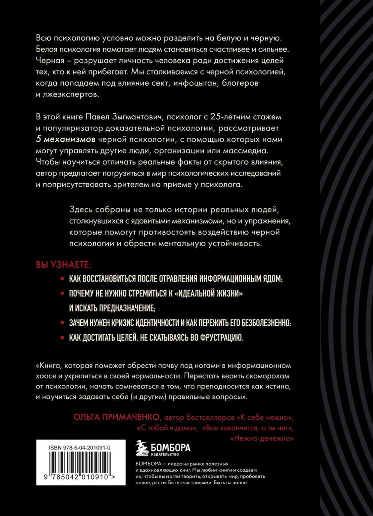 В этой книге Павел Зыгмантович, психолог с 25-летним стажем и популяризатор доказательной психологии, рассматривает 5 механизмов черной психологии, с помощью которых нами могут управлять другие люди, организации или массмедиа. Чтобы научиться отличать реальные факты от скрытого влияния, автор предлагает погрузиться в мир психологических исследований и поприсутствовать зрителем на приеме у психолога.