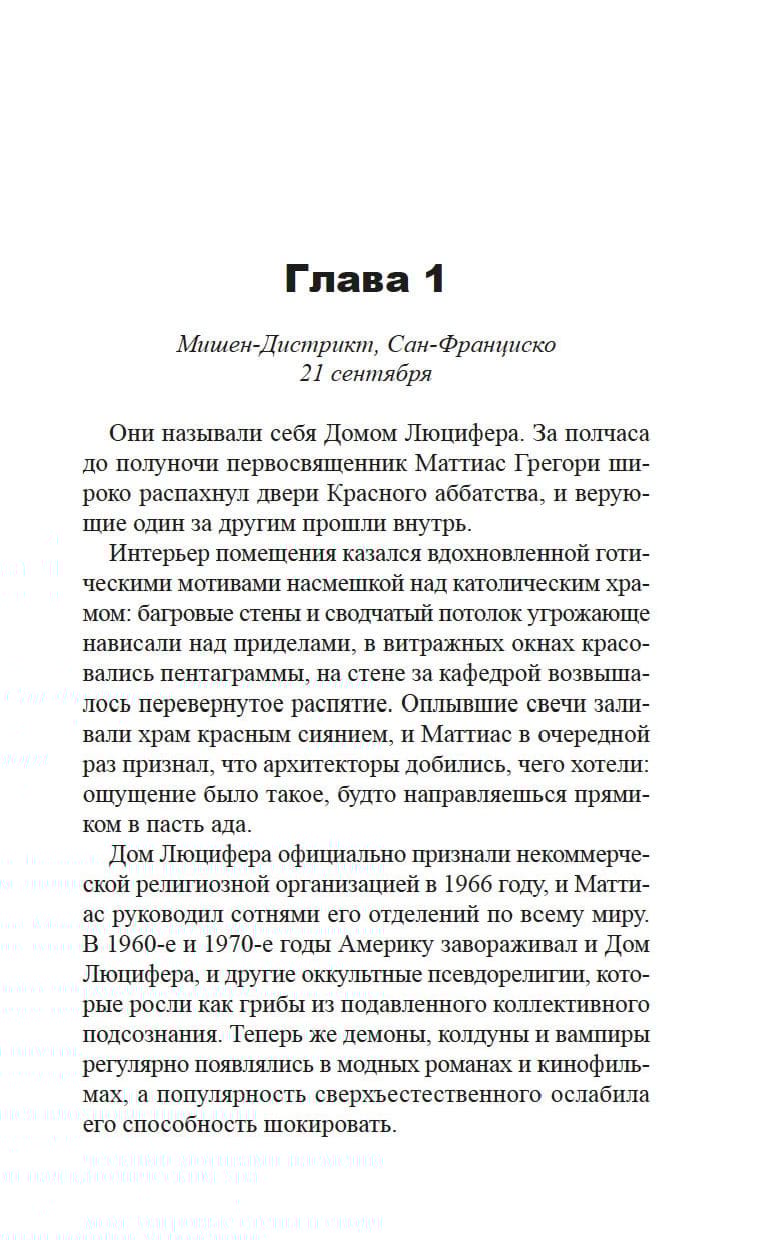 У детективов Виктора Радека, профессора религиозной феноменологии, и Доминика Грея, бывшего морпеха, особая специализация: они расследуют преступления, связанные с таинственными и необъяснимыми явлениями. Их ждет очередное жуткое дело: загадочная фигура в черной мантии сжигает лидеров скандальных сатанинских сект. И хотя впору подумать о потусторонней каре за грехи, у напарников другое мнение…