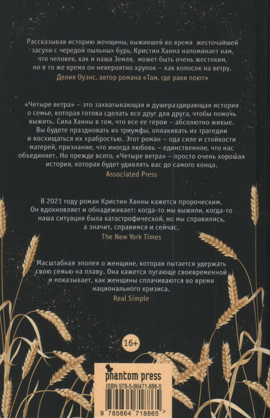Элса, мужественная женщина, к которой жизнь с юных лет не проявляла особой благосклонности, переживает, в первую очередь, за двух своих детей, которые уже забыли, что такое дождь, каково это — поесть досыта и как выглядит приличная одежда. Они уже давно не живут, а выживают, и настал момент, когда выбора у Элсы не остается: если она хочет спасти детей, то должна решиться и покинуть родной дом, отправиться в неведомое, надеясь, что там они обретут благополучие. «Четыре ветра» — это неизгладимый портрет Америки и американской мечты, увиденный глазами неукротимой женщины, чья храбрость и жертвенность станут определяющими для целого поколения.