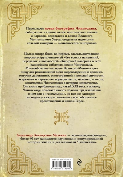 Автор книги Александр Мелехин — выдающийся исследователь, один из крупнейших в России и в мире специалистов по Чингисхану. Как монголовед-переводчик он более 40 лет занимается изучением и популяризацией наследия Чингисхана. Автор таких книг, как «Сокровенное сказание монголов» (перевод историко-литературного памятника XIII века совместно с Г. Б. Ярославцевым), «Чингисиана. Свод свидетельств современников», «Чингисхан. Сокровенное сказание», «Ордынский период. Голоса времени», «Ордынский период. Лица эпохи», «Чингисхан. Имперская идея покорителя мира», «Чингисхан», «Тамерлан».