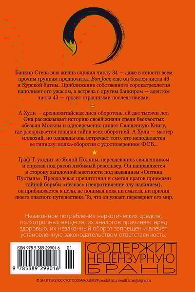 А Хули — древнекитайская лиса-оборотень, ей две тысячи лет. Она рассказывает историю своей жизни среди бесхвостых обезьян Москвы и одновременно пишет Священную Книгу, где раскрывается главная тайна всех оборотней. А Хули — мастер иллюзий, но однажды она встречает того, кто неподвластен ее гипнозу: волка-оборотня с удостоверением ФСБ...