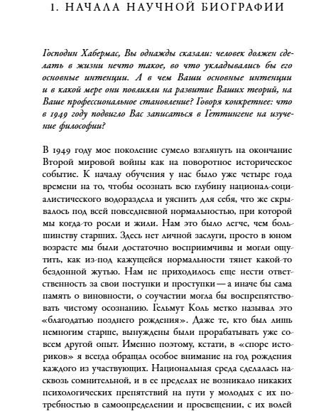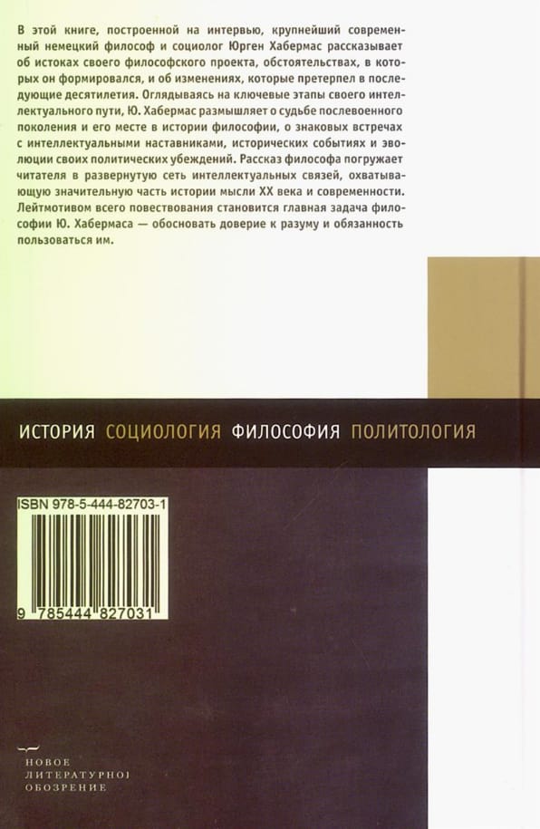 В этой книге, построенной на интервью, крупнейший современный немецкий философ и социолог Юрген Хабермас рассказывает об истоках своего философского проекта, обстоятельствах, в которых он формировался, и об изменениях, которые претерпел в последующие десятилетия. Оглядываясь на ключевые этапы своего интеллектуального пути, Ю. Хабермас размышляет о судьбе послевоенного поколения и его месте в истории философии, о знаковых встречах с интеллектуальными наставниками, исторических событиях и эволюции своих политических убеждений. Рассказ философа погружает читателя в развернутую сеть интеллектуальных связей, охватывающую значительную часть истории мысли XX века и современности. Лейтмотивом всего повествования становится главная задача философии Ю. Хабермаса — обосновать доверие к разуму и обязанность пользоваться им.