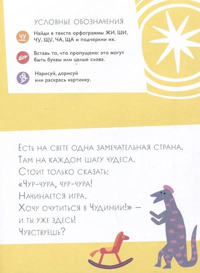 Как помочь своему младшекласснику запомнить и научиться применять правила правописания жи-ши, ча-ща и чу-щу? Как превратить урок русского языка в увлекательное приключение? Как не отбить у ребенка желание учиться? Поможет книга-рабочая тетрадь «Чудесное путешествие в Чудинию». Кандидат педагогических наук, писатель и журналист Марина Аромштам предлагает школьникам отправиться в сказочную Чудиню: страну, где живут милые чудинцы, приручившие чудовище, уважающие чай с чабрецом и ездящие на жирафах, которые питаются щавелем. Заметили, как часто повторяются гласные после шипящих? Читая историю чудинцев и выполняя задания, ребенок просто не сможет не запомнить эти орфограммы!