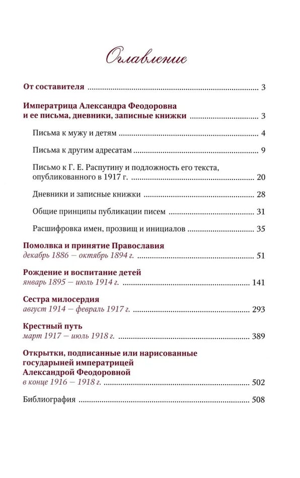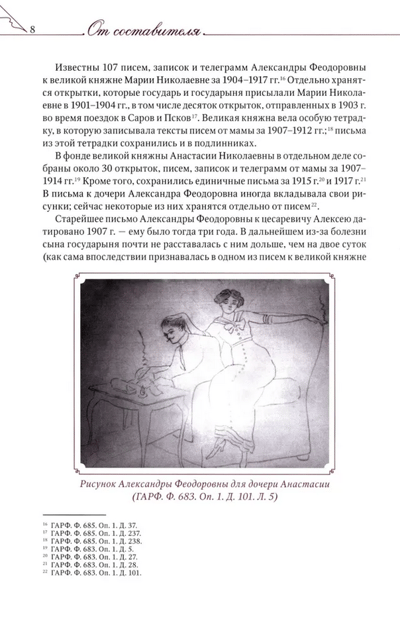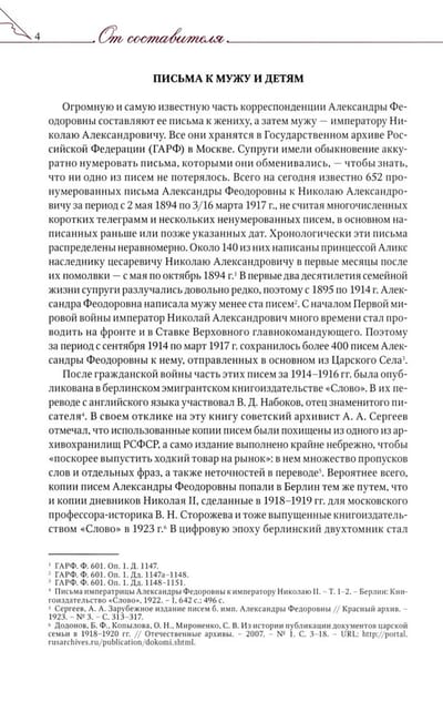 В книге собрана корреспонденция императрицы Александры Феодоровны, охватывающая период с 1886 по 1918 г. Письма, записки, открытки и телеграммы государыни дают яркое представление о ее сильной и разносторонней личности, основных этапах её жизненного и духовного пути, взглядах на воспитание детей и вопросы веры, взаимоотношениях с родными и близкими и в целом о жизни Царской семьи. Помимо многочисленных печатных источников, использованы материалы из Государственного архива Российской Федерации, библиотеки Йельского университета (США), Российского фонда культуры. Российского государственного архива социально-политической истории, Музея Православной Церкви Финляндии Riisa (. Kyonno Финляндия) Значительная часть переводов и подлинных текстов публикуется впервые. Письма снабжены примечаниями, дополнительными текстовыми и иллюстративными материалами, a тaкже указателем, в котором расшифрованы встречающиеся имена, инициалы прозвища. B предисловии представлен краткий обзор сохранившейся корреспонденции, дневников и записных книжек Александры Феодоровны.