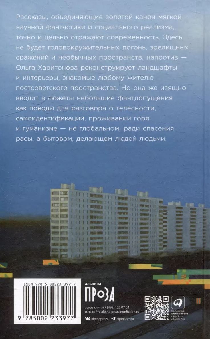 Рассказы, объединяющие золотой канон мягкой научной фантастики и социального реализма, точно и цельно отражают современность. Здесь не будет головокружительных погонь, зрелищных сражений и необычных пространств, напротив — Ольга Харитонова реконструирует ландшафты и интерьеры, знакомые любому жителю постсоветского пространства. Но она же изящно вводит в сюжеты небольшие фантдопущения как поводы для разговора о телесности, самоидентификации, проживании горя и гуманизме — не глобальном, ради спасения расы, а бытовом, делающем людей людьми.