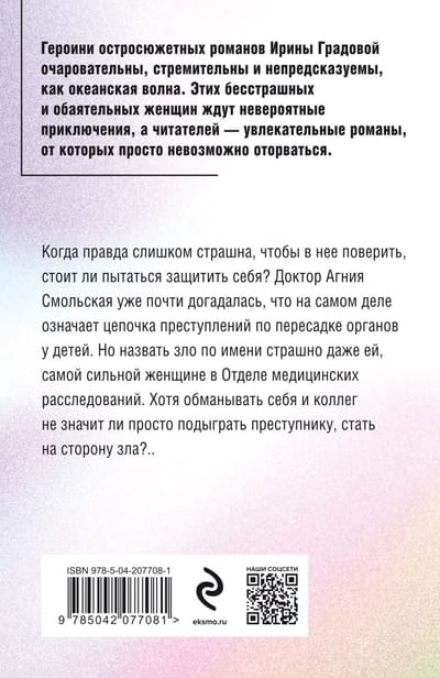 Когда правда слишком страшна, чтобы в нее поверить, стоит ли пытаться защитить себя? Доктор Агния Смольская уже почти догадалась, что на самом деле означает цепочка преступлений по пересадке органов у детей. Но назвать зло по имени страшно даже ей, самой сильной женщине в Отделе медицинских расследований. Хотя обманывать себя и коллег не значит ли просто подыграть преступнику, стать на сторону зла?..