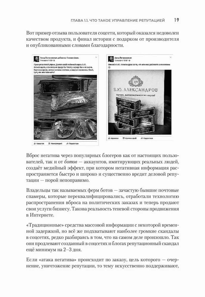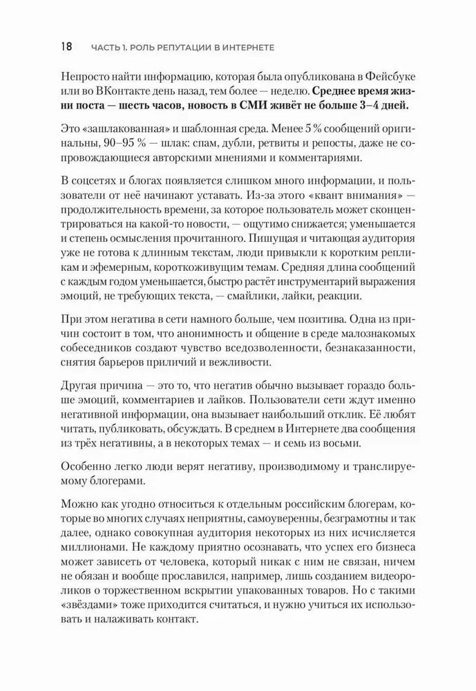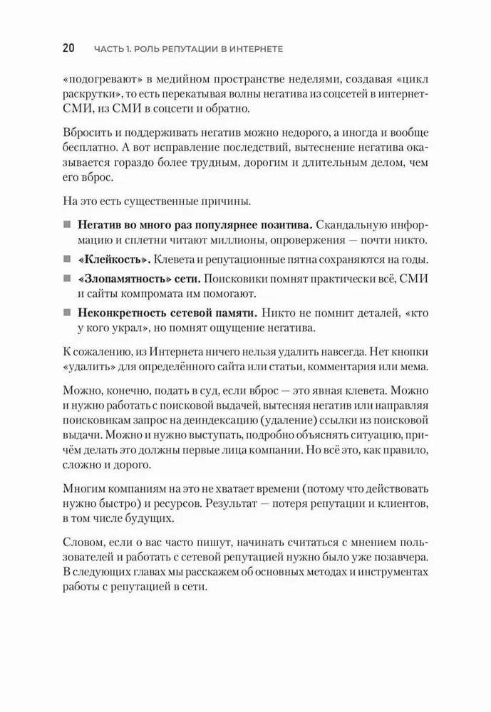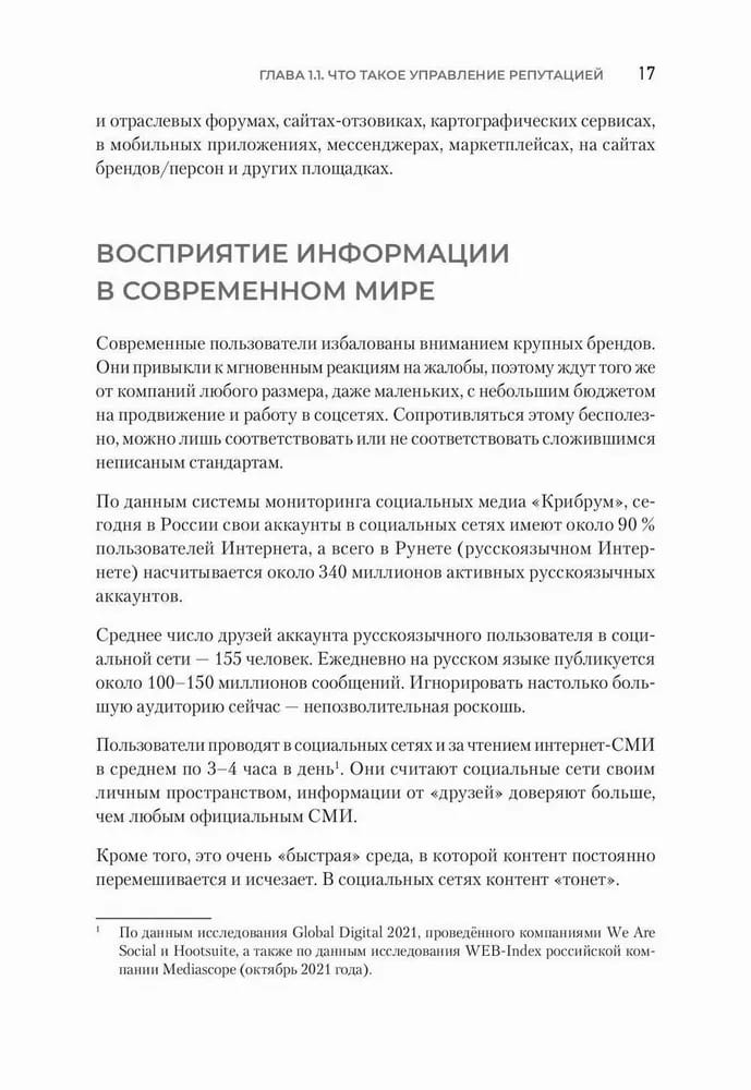 А законы эти существуют, они уже осмыслены и исчислены, ими можно пользоваться для продвижения бизнеса, управления репутацией, усиления влияния и роста продаж. Управление репутацией не магия, не квантовая физика, это эффективное ремесло. В книге описаны основные принципы, приёмы и секреты этого ремесла, так что она будет не только интересна читателю, но и принесёт практическую пользу. Репутация сейчас в основном формируется и воспринимается именно в цифровом пространстве, поэтому мы будем обсуждать цифровую репутацию как совокупность позитивных и негативных откликов, высказываний, сообщений, текстов, статей, обсуждений, видео, отзывов о персоне, бренде, продукте, организации и персонах во всех цифровых пространствах и каналах: соцсетях, интернет-СМИ, мессенджерах и т. п. Читайте, применяйте описанные методы и инструменты, пробуйте. Мы уверены — у вас всё получится. Нужно просто делать — и всё будет.
