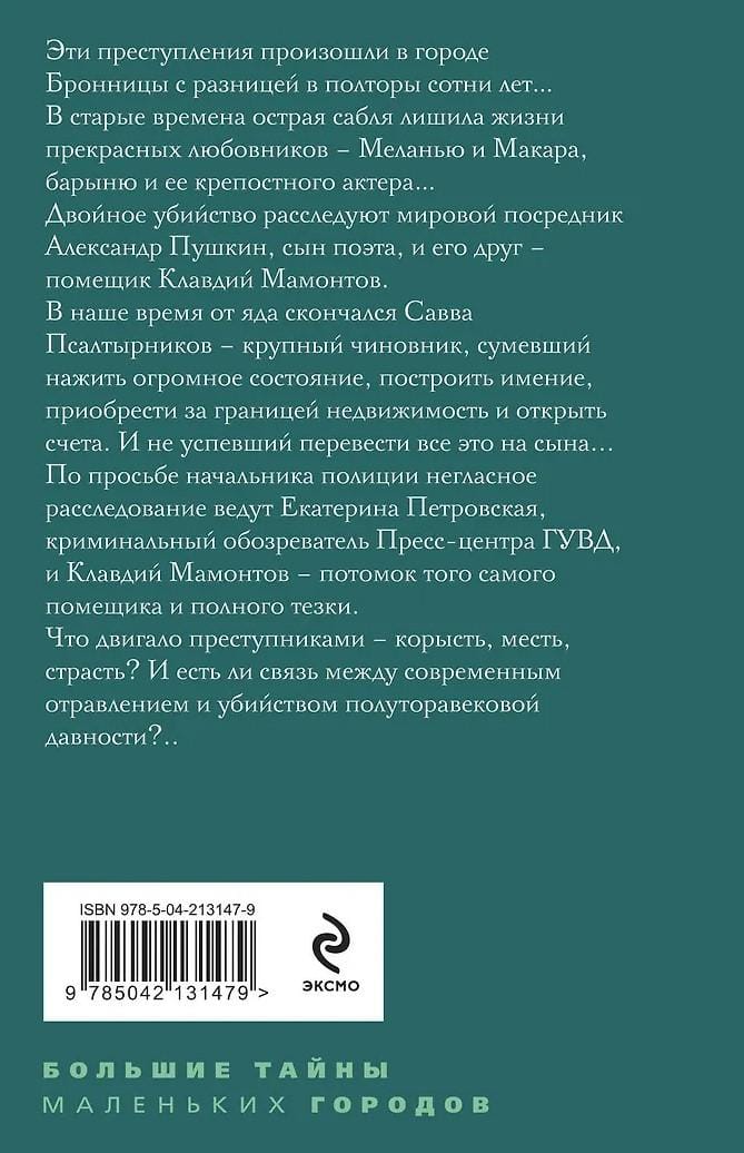 В наше время от яда скончался Савва Псалтырников — крупный чиновник, сумевший нажить огромное состояние, построить имение, приобрести за границей недвижимость и открыть счета. И не успевший перевести все это на сына... По просьбе начальника полиции, негласное расследование ведут Екатерина Петровская, криминальный обозреватель Пресс-центра ГУВД, и Клавдий Мамонтов — потомок того самого помещика и полный тезка.