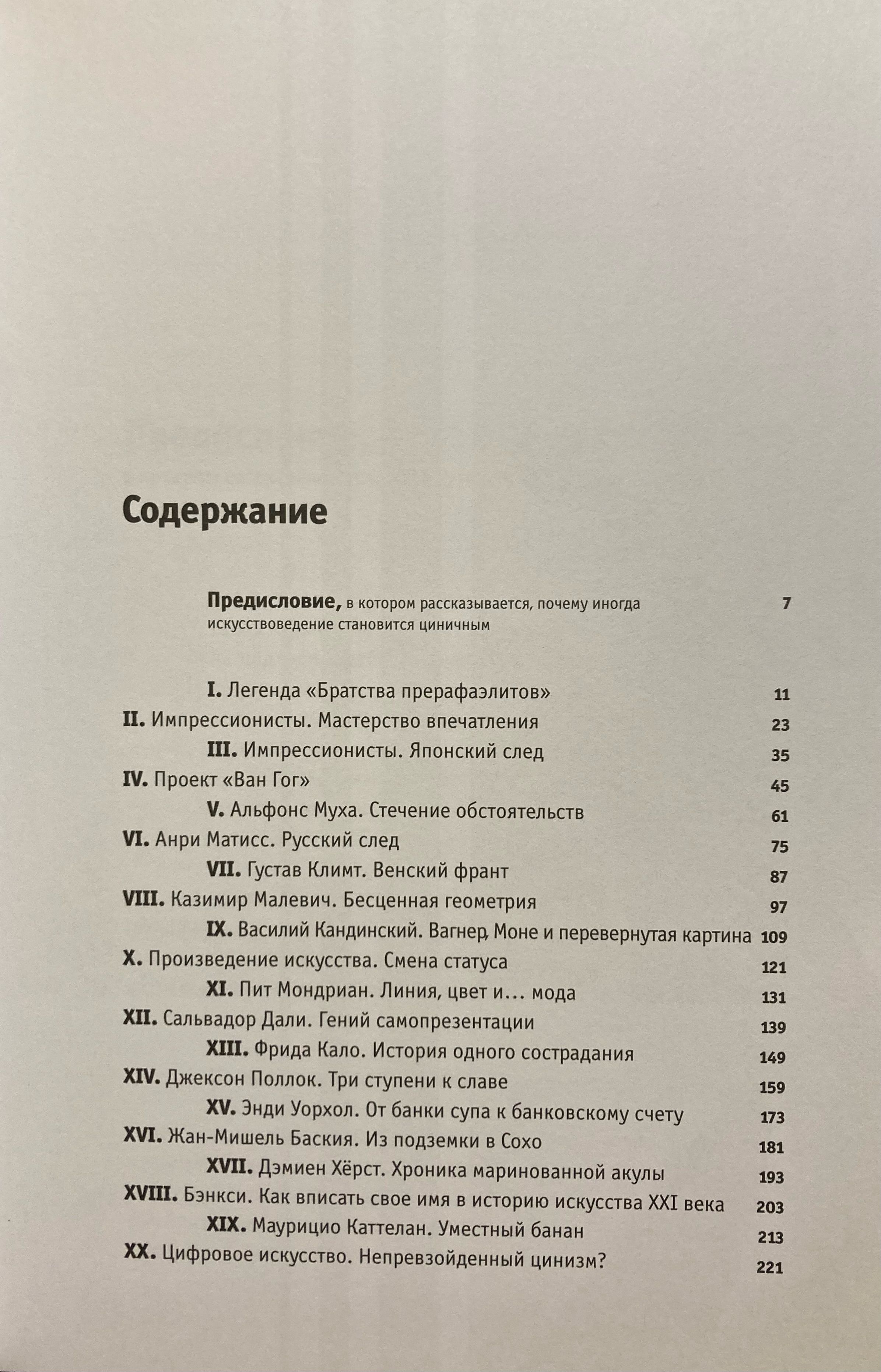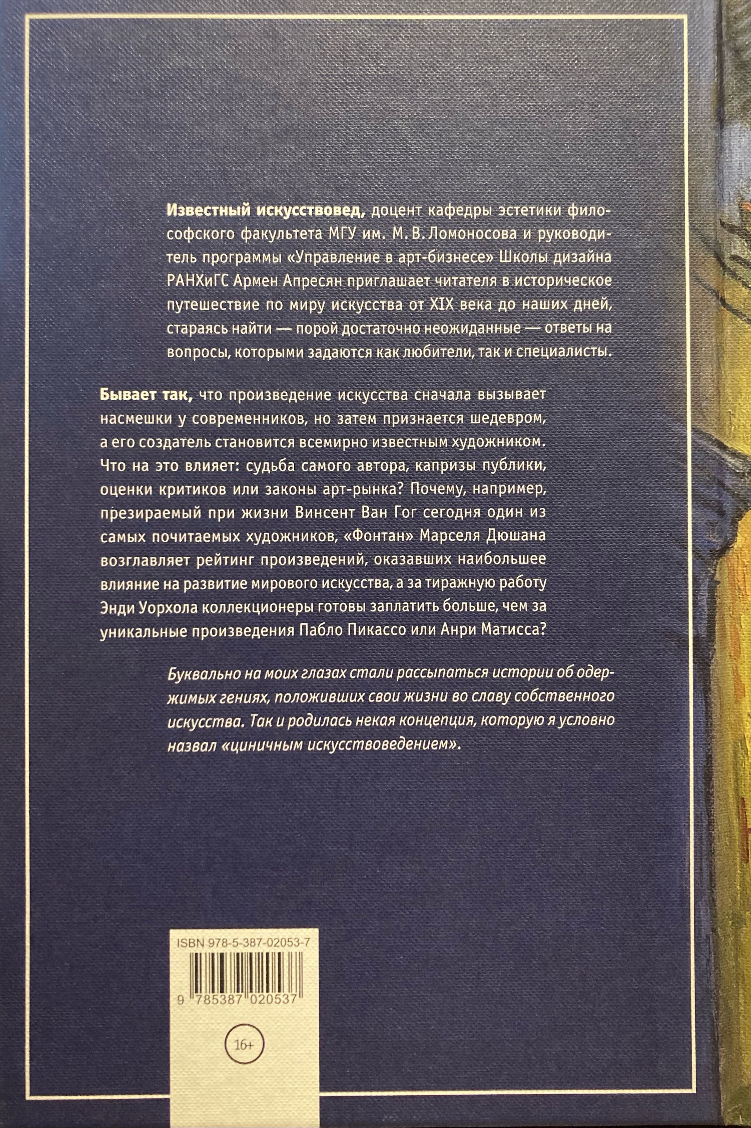 Известный искусствовед, доцент кафедры эстетики философского факультета МГУ им. М. В. Ломоносова и руководитель программы «Управление в арт-бизнесе» Школы дизайна РАНХиГС Армен Апресян приглашает читателя в историческое путешествие по миру искусства от XIX века до наших дней, стараясь найти — порой достаточно неожиданные — ответы на вопросы, которыми задаются как любители, так и специалисты.
