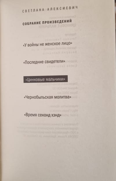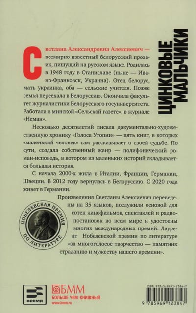 «Цинковые мальчики» — третья книга художественно-документального цикла «Голоса Утопии» Светланы Алексиевич, лауреата Нобелевской премии по литературе «за многоголосое творчество — памятник страданию и мужеству нашего времени».
