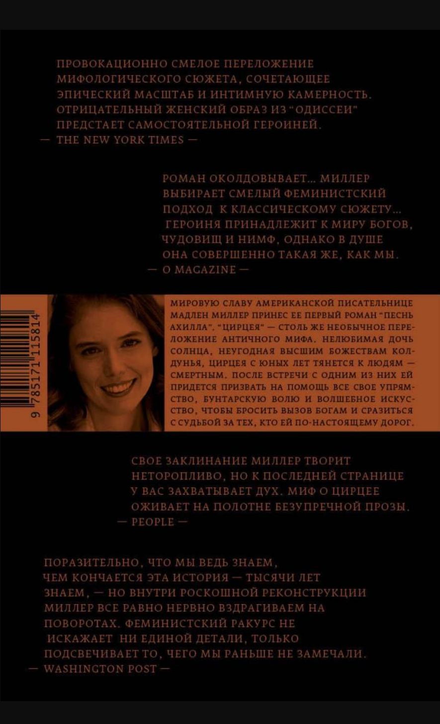 Американка Мадлен Миллер, филолог классик и шекспировед, стала известна читателям всего мира благодаря своему дебютному роману «Песнь Ахилла». «Цирцея» тоже уходит корнями в гомеровский эпос и так же завораживает неожиданной реконструкцией личной истории внутри мифа. Дочь титана Гелиоса, самого солнца, Цирцея растет в чертогах отца одинокой и нелюбимой. Божественное могущество ей недоступно, но когда дает о себе знать ее непонятный и опасный дар, боги и титаны отправляют новоявленную колдунью в изгнание на необитаемый остров. Лишь изредка внешний мир врывается в ее одинокую вечность, пока не пристает к берегу избитый штормами корабль Одиссея. И далеко не всем последствиям этой встречи суждено остаться в легендах...