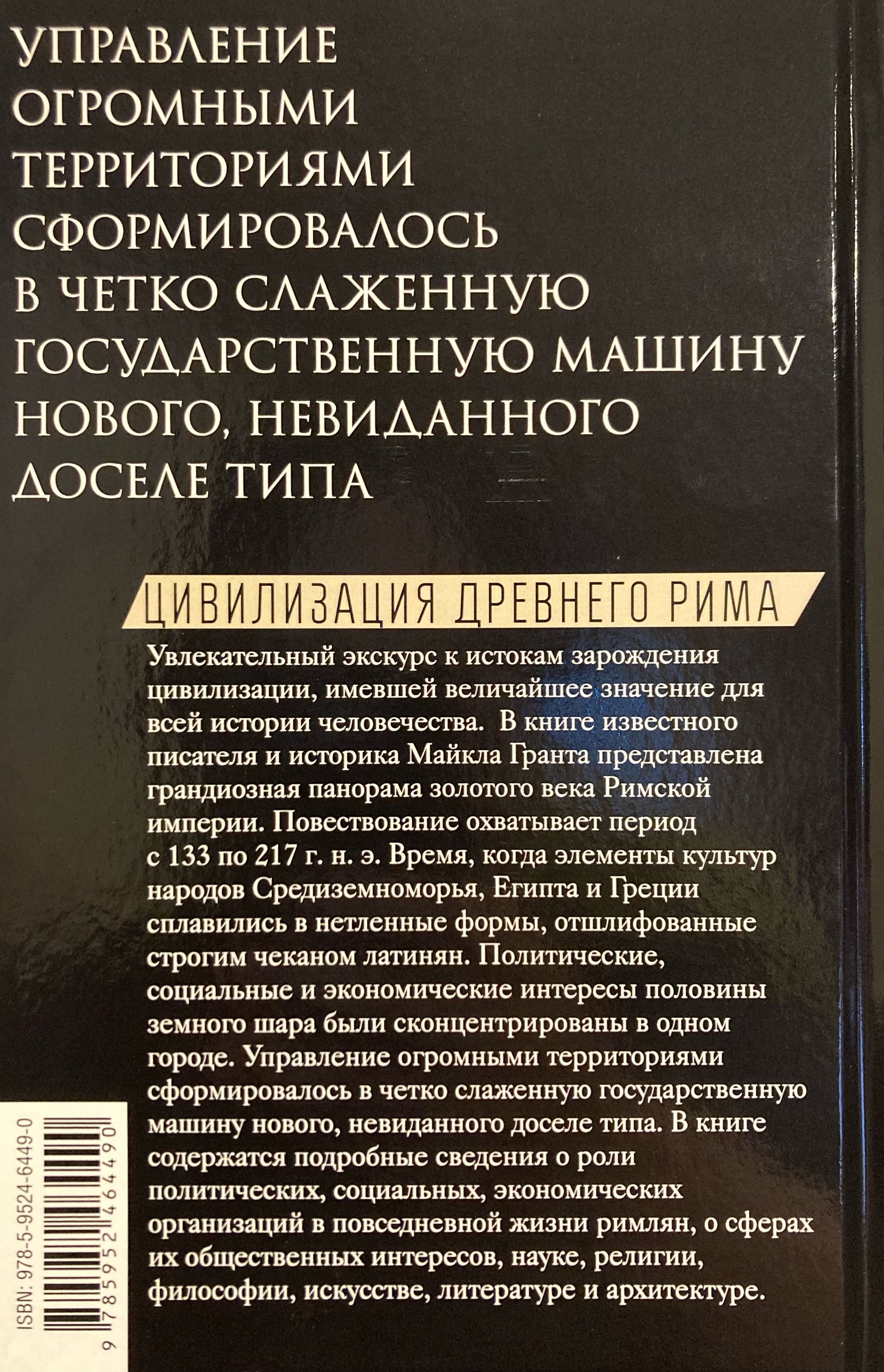 В книге известного писателя и историка Майкла Гранта содержатся обширные сведения о внутреннем устройстве римского государства и повседневной жизни его граждан. Исследуется сфера их общественных интересов - наука, религия, философия, искусство, литература и архитектура. Анализируется фундаментальное влияние римской цивилизации на последующие исторические формации.