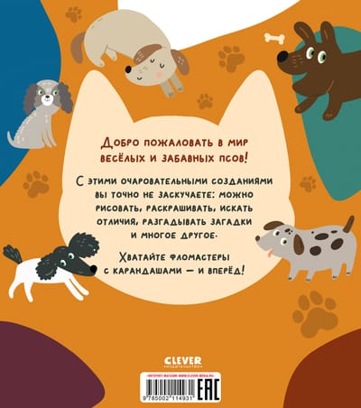 Добро пожаловать в мир весёлых и забавных псов! С этими очаровательными созданиями вы точно не заскучаете: можно рисовать, раскрашивать, искать отличия, разгадывать загадки и многое другое. Хватайте фломастеры с карандашами - и вперёд!